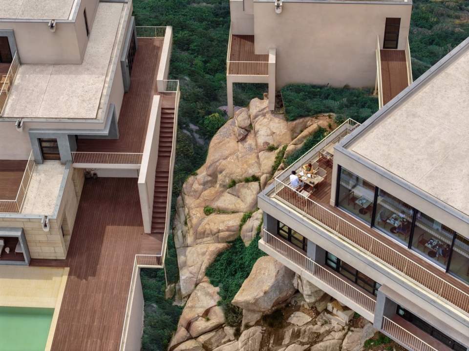灯塔酒店的建筑体量根据场地内礁石分布及陡峭地形进行组织,分解为一系列阶梯状错位堆叠的模块单元。这种阶梯式布局策略性地适应了山体坡度,并生成了多角度的景观视野。同时,该建筑群的体量形态与邻近现存原始民居聚落的肌理形成回应。
