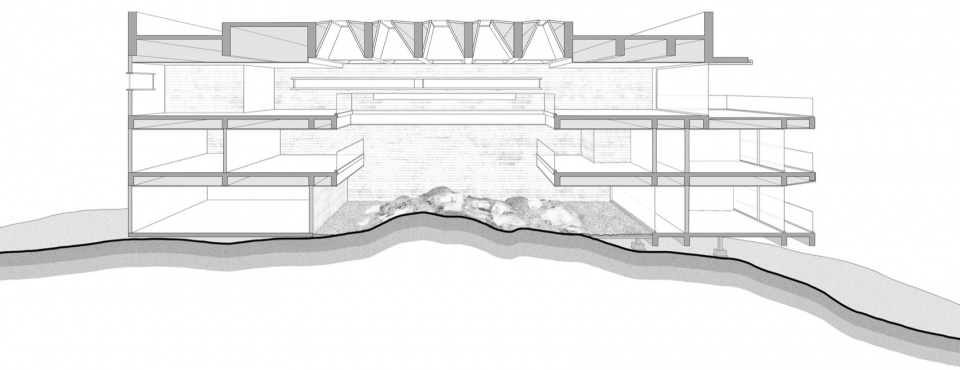 The volume of the modern building echoes the primitive reef in another way. The design uses isolated foundations to suspend the solid space above the reef, further reducing the sense of weight. The smooth bottom surface of the building and the rough, angular surface of the reef create a distinctive gray space, adding interest to the landscape.