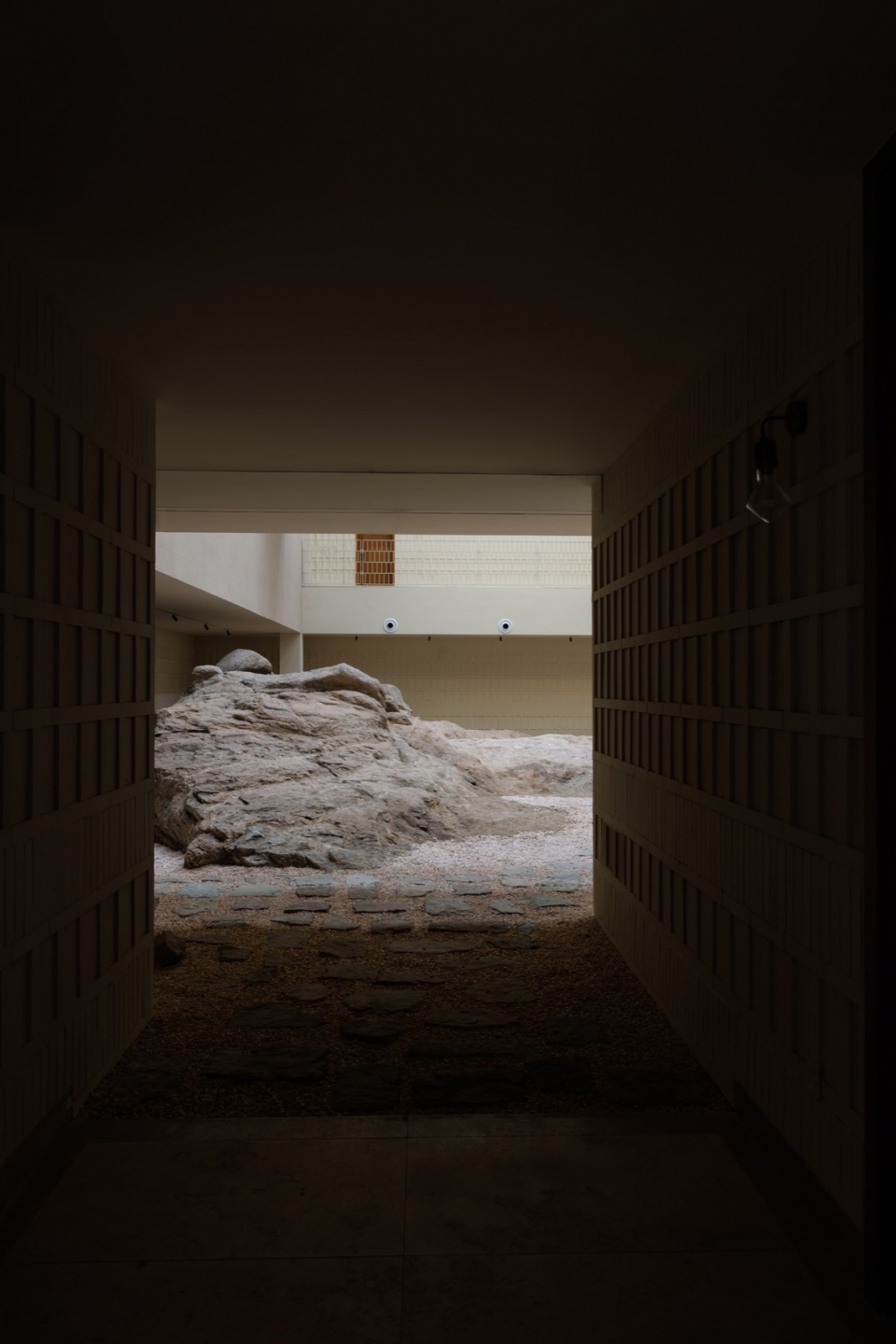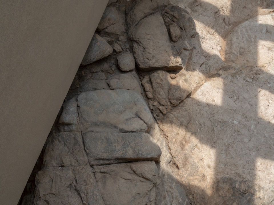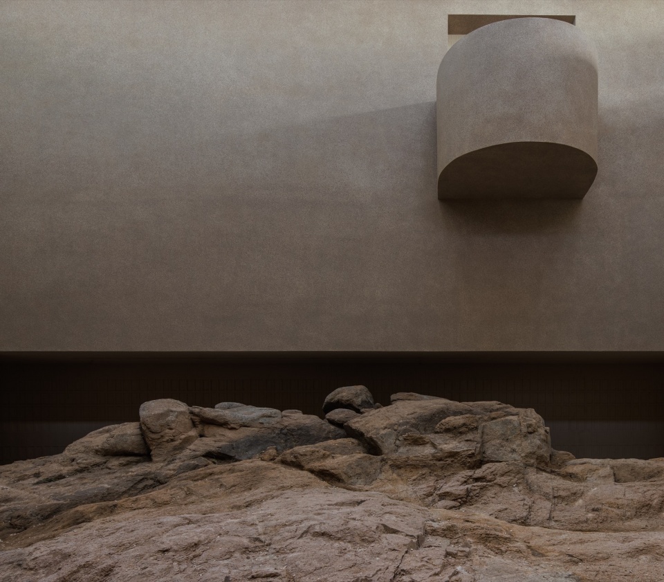 A组团以巨大而空旷的岩石大厅为核心,历经风化的原始礁石被保留建筑底面,建筑像个“罩子”来保护原始礁石,让人有机会去靠近礁石的肌理。设计试图模糊了“内”与“外”的绝对界限,让空间本身成为一种引导观看的媒介。四周墙面的处理让参观者在脑中联想室外景观,将其引入室内静谧的空间,从而完成“室外——室内”的转化。当阳光透过天窗洒落在粗粝的岩石上,人们可以在这里近距离接触岩石的质感,感受到时间流逝下永恒不变的自然创造。