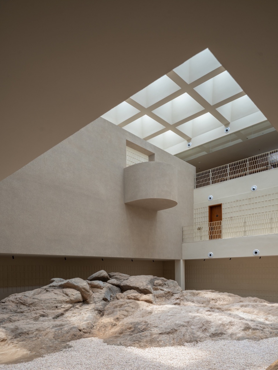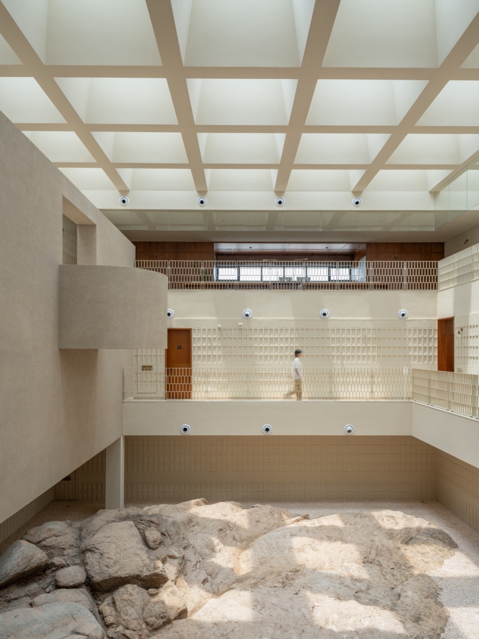 Block A is centered around a vast, open rock hall. The weathered, pristine reef stones are preserved at the base of the building, which acts like a “canopy” to protect them, allowing visitors to get up close to the texture of the reef stones. The design blurs the absolute boundaries between ‘inside’ and “outside,” making the space itself a medium that guides the viewer’s perception. The treatment of the surrounding walls prompts visitors to mentally associate the outdoor landscape with the serene indoor space, thereby completing the transformation from “outdoor” to “indoor.” When sunlight filters through the skylights onto the rugged rocks, people can experience the texture of the rocks up close and feel the timeless natural creation that endures through the passage of time.