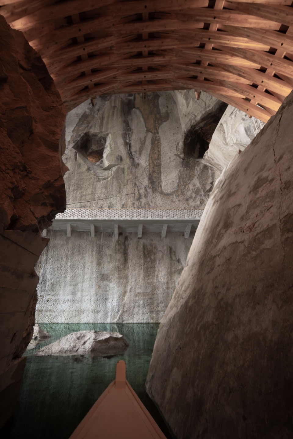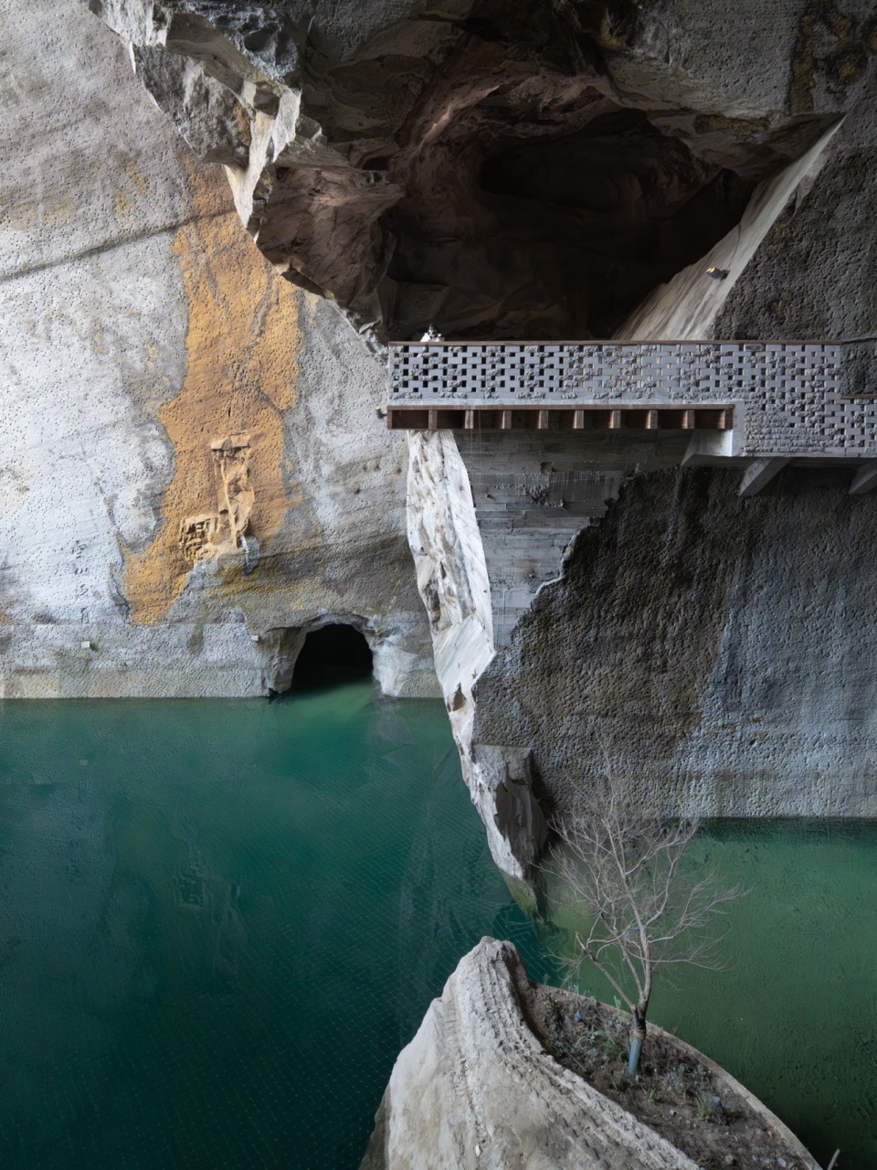 The quarry contains extensive subterranean chambers where groundwater accumulation has formed turquoise-blue pools in Quarries No. 1 and No. 2. These water bodies create a striking chromatic contrast with the yellow rock paintings, emerging as another key spatial feature. The design intentionally links these pools within Quarry No. 1, incorporating three docking piers at varying elevations to establish a water passage. This intervention enables boat access, offering multi-angled perspectives to experience the quarry.