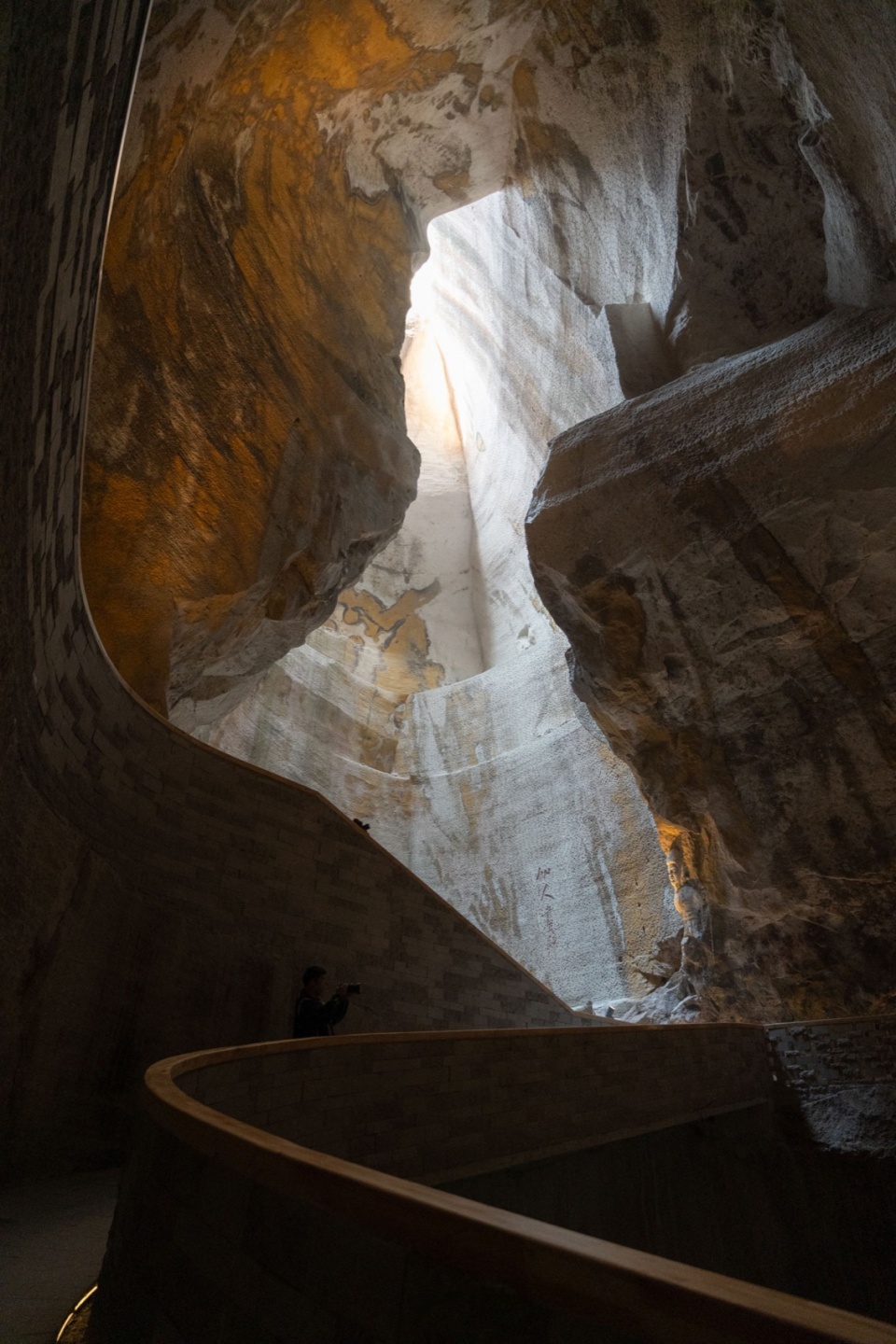 The quarry interior contains naturally uneven mineral compositions within the mountain mass. After centuries of manual extraction, the mineral cross-sections have formed massive yellow-toned natural rock paintings—a defining visual feature of the site. Notably, these yellow mineral deposits are the etymological origin of “Huangyan” (literally “Yellow Rock”). To emphasis this local identity and spatial character, we directed the lighting design to strategically illuminate these mineral “paintings.” The interplay between the minerals’ yellow hues and warm artificial lighting transforms them into colossal luminous elements within the space, while simultaneously guiding circulation paths.