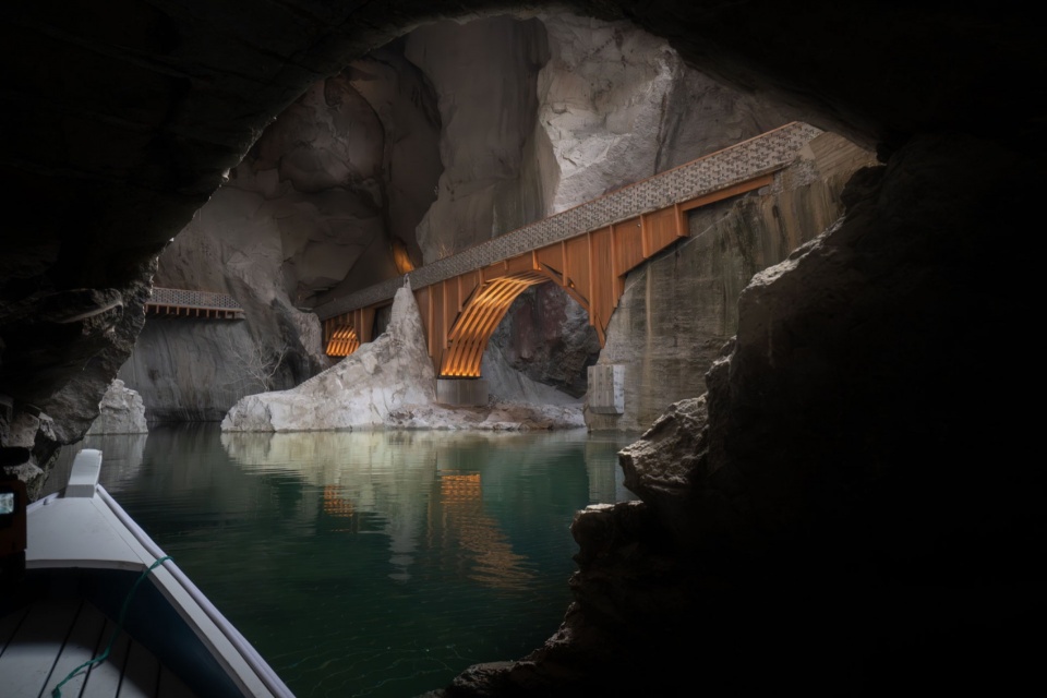 石窟内部还有大量的下挖洞窟,由于地下水沉积,在一号和二号石窟内形成蓝绿颜色的水体,和黄色岩画对比, 也是石窟空间内的主要特征。设计在一号洞裤内部将水体打通,设置三个上下船的码头,这样在一号石窟内形成了一条水路,提供观看石窟的多方位视角。
