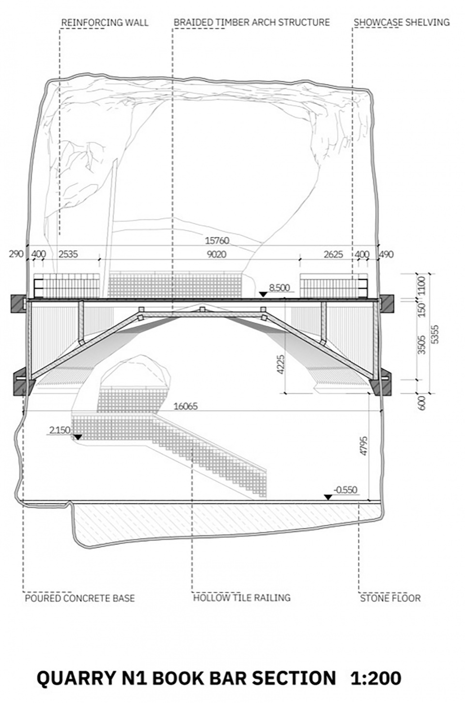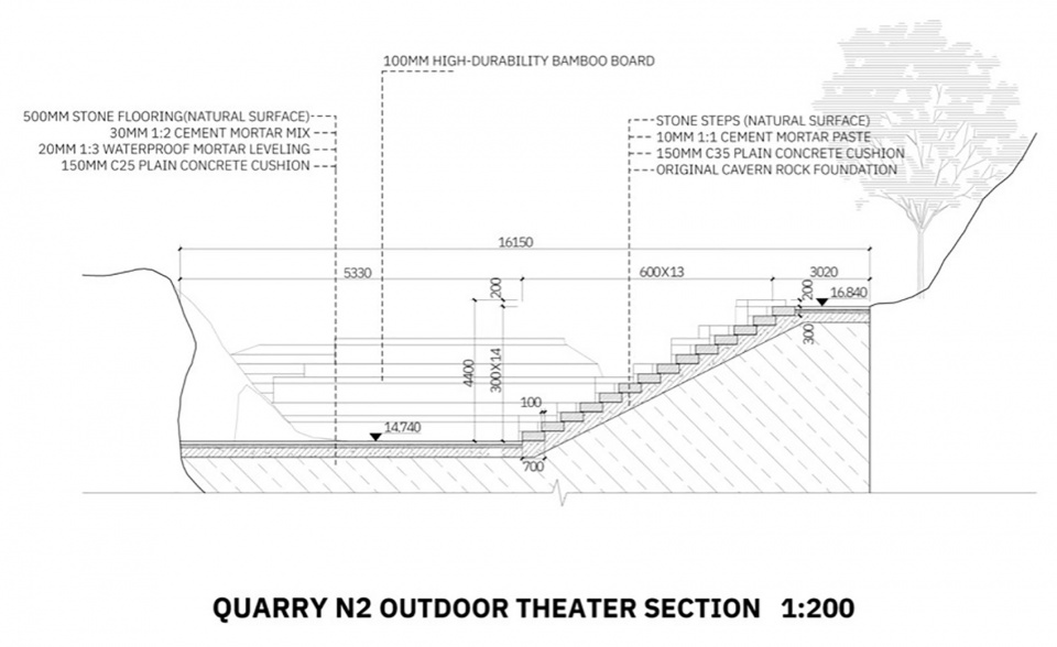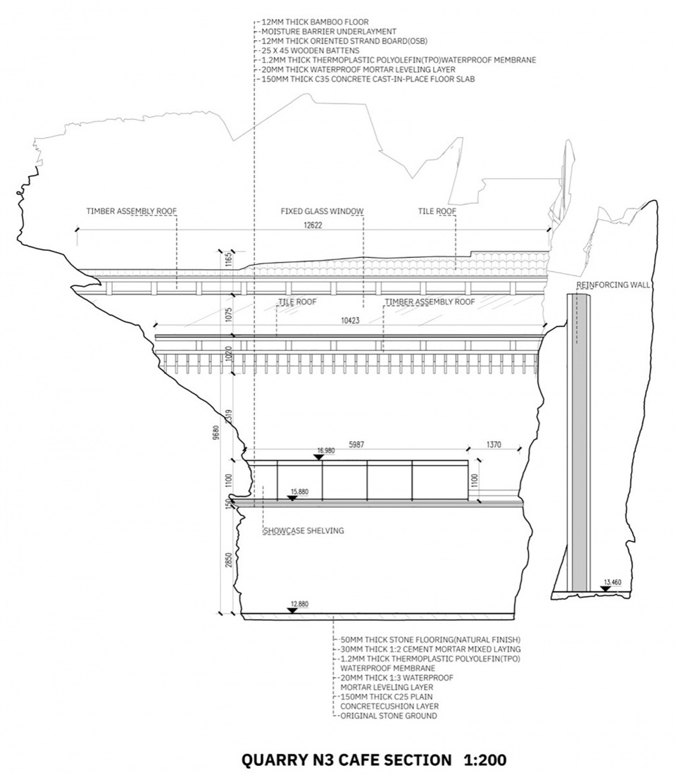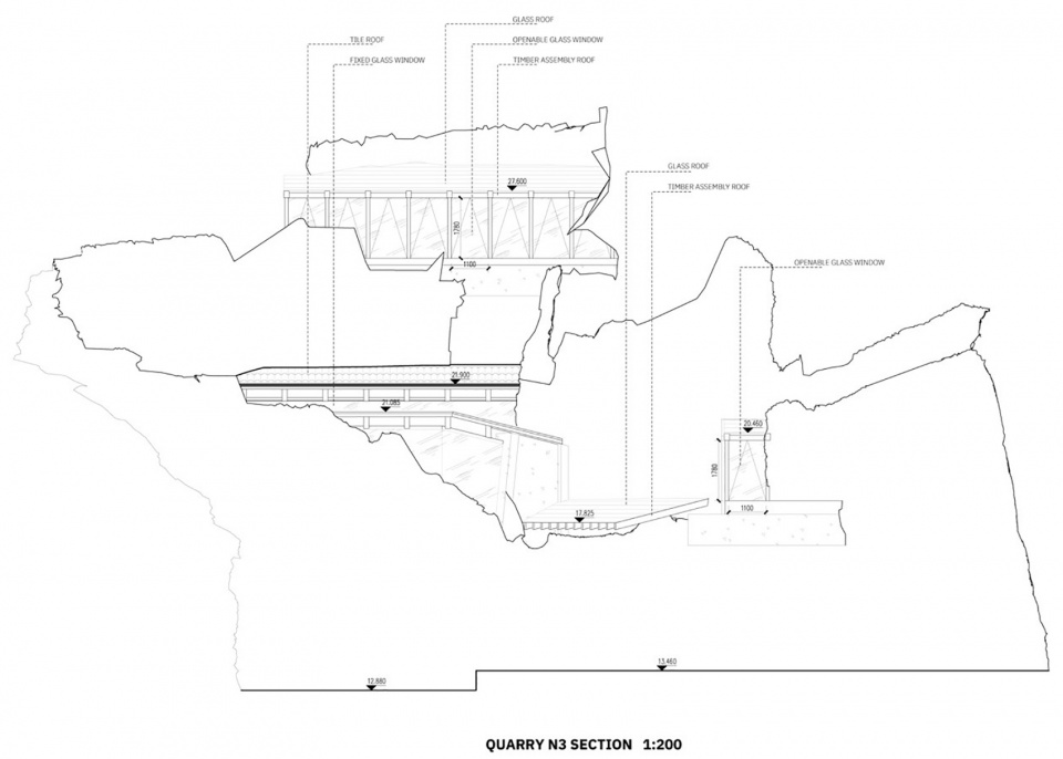 The Quarry No. 3 is composed of a series of narrow tunnels connecting secluded spaces. The renovation of this quarry utilized the wood weaving technique to seal the opening at the top of the quarry, meeting the functional requirements in the lightest way possible without damaging the original appearance of the quarry. Quarry No. 3 will function as a restaurant, café, and reception area.