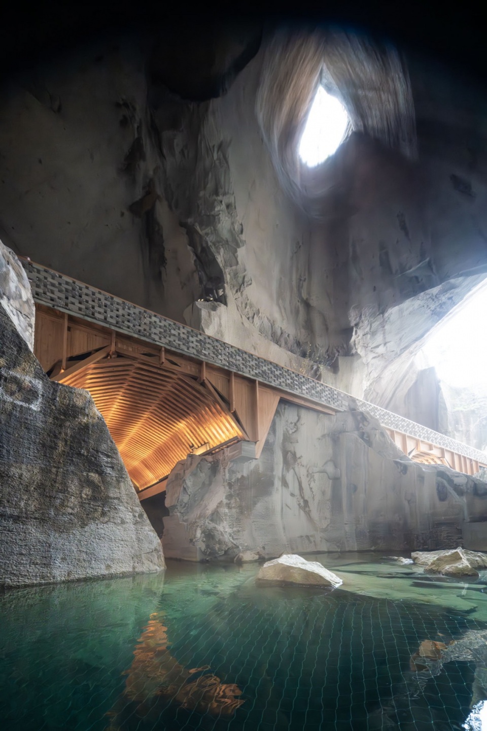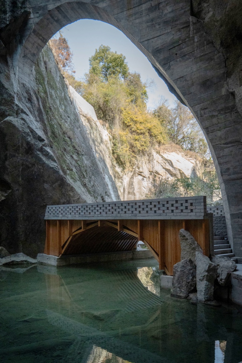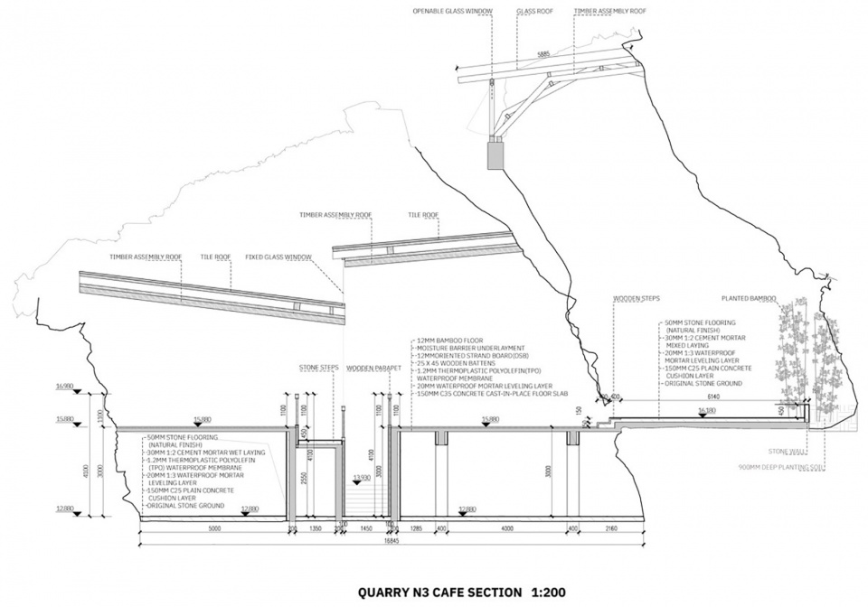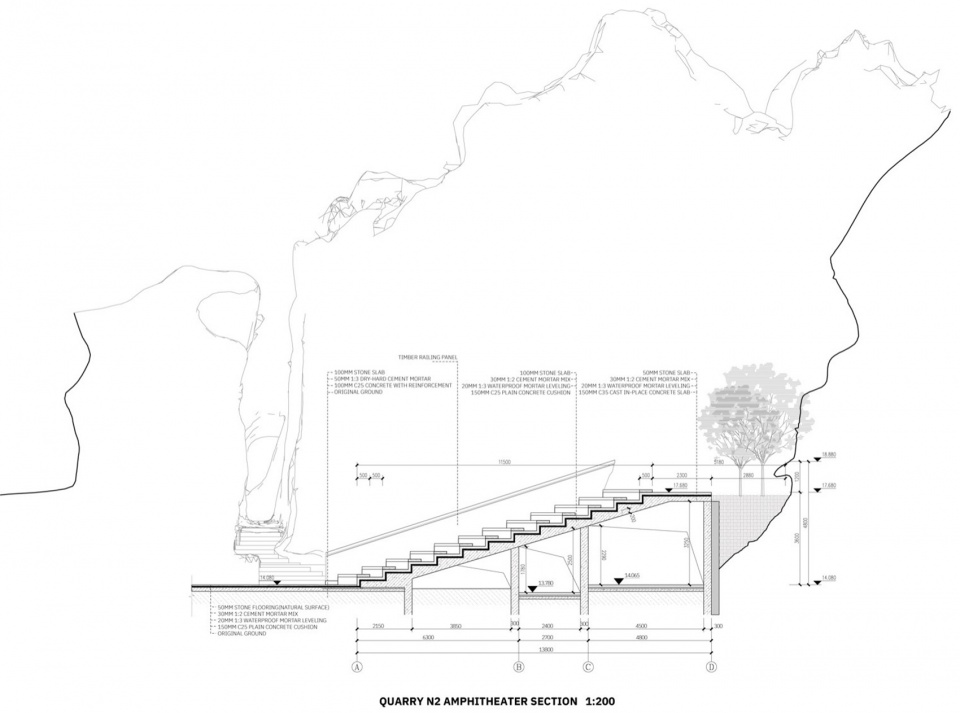 The Quarry No. 3 is composed of a series of narrow tunnels connecting secluded spaces. The renovation of this quarry utilized the wood weaving technique to seal the opening at the top of the quarry, meeting the functional requirements in the lightest way possible without damaging the original appearance of the quarry. Quarry No. 3 will function as a restaurant, café, and reception area.