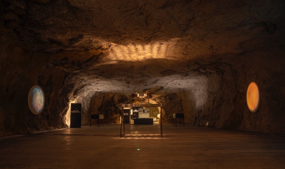 黄岩石窟内因山体成分带有不均匀的矿物成分、后经过千年的手工开采、矿物质的切面形成巨型的黄色的天然岩画。这是石窟的一个重要视觉特征,而这种带黄色矿物质的岩体构成也正是黄岩这个名称的由来。为了强调这种地方特质和空间特征,我们请照明设计将灯光重点投射在这些岩画上、矿物质的黄色和暖色调灯光结合,在空间里成为一个个巨型的发光体,同时提示路径流线。