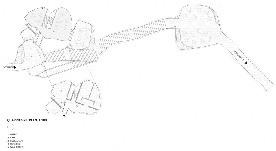 项目总占地面积约20,000平方米,包含三个洞窟群落。设计改造的重点在于引入必要的通行路径,通过扩大平台和利用石窟现有几何形状的空间来创造停留点。这些空间主要是便于在场地内通行的走道,同时将人体尺度的活动与采石场的工业规模形成对比。在功能上,设计的重点一方面是对路径、交通的梳理,另一方面是提供停留空间,作为未来业态和活动场所,比如咖啡厅、小剧场、文创空间等等。