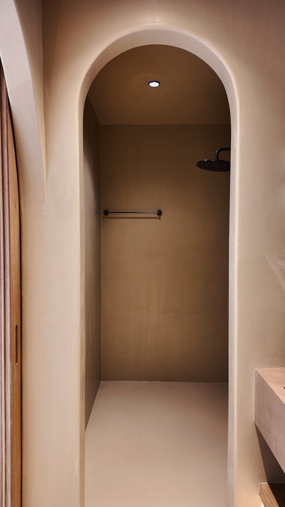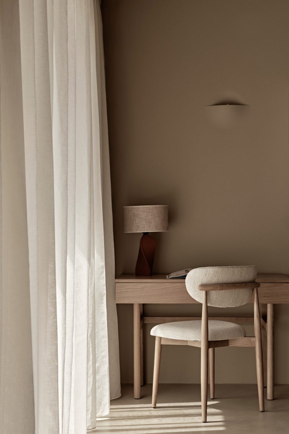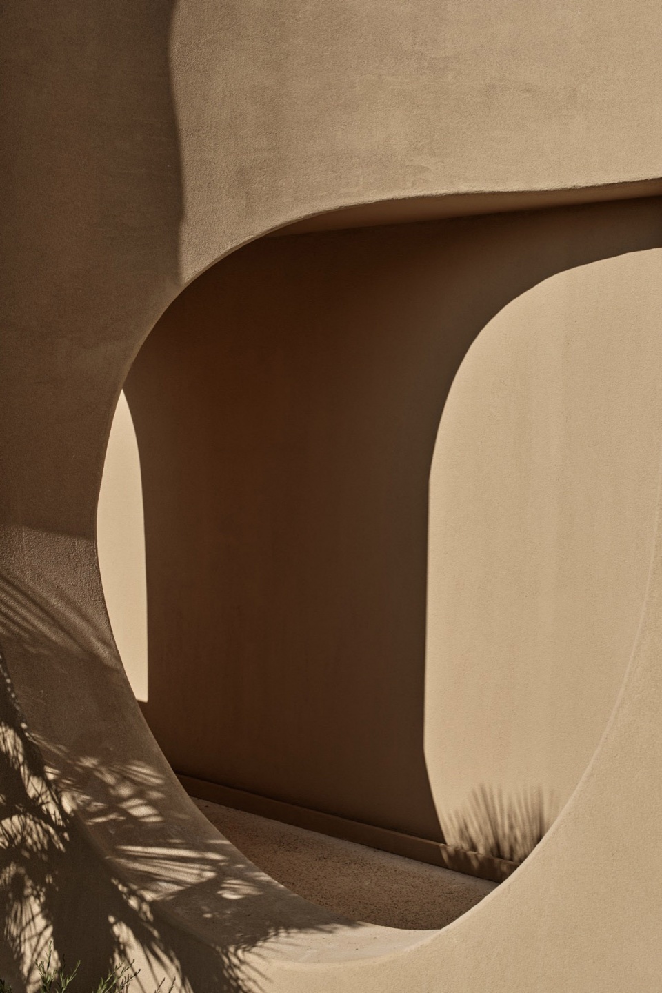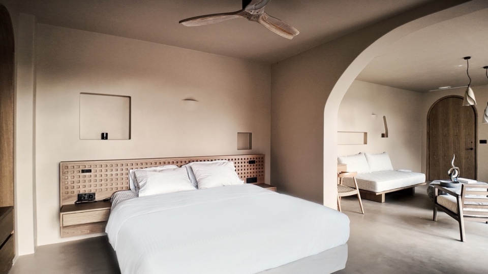 最终呈现出的建筑作品紧贴地形自然走势,仿佛自然而然地“消隐”于环境中。所有套房采用亲自然(Biophilic)设计,大多为半地下结构,配有绿植屋顶露台,以提高能效并吸收碳排放。房间与走廊中设有拱形落地北向窗与大尺度的仿生开口,引入充足自然光与空气流通,最大限度减少对人工照明与空调的依赖。在亚里士多德大学教授Agis Papadopoulos的建议下,酒店最终选择了木材、石材与泥土等天然、可持续的材料,并配以温润的色调——暖米色、橄榄绿与柔和灰色,营造出宁静、如洞穴般疗愈的室内氛围。