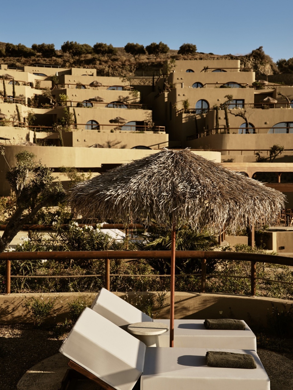 The couple oversaw every aspect of the hotel’s creation following the guiding principle of creating a sanctuary where sustainability, serenity, and luxury coexist. To help realize their vision, Tourkomanis and Low enlisted the award-winning Athens-based studio Pieris.Architects and landscape architect Karolos Chanikian who took a “future primitivism” approach. This architectural and cultural style blends ideas of the past with futuristic elements, focusing on a return to simpler, more primal ways of living while imagining new, sustainable, and technologically enhanced methods of life.