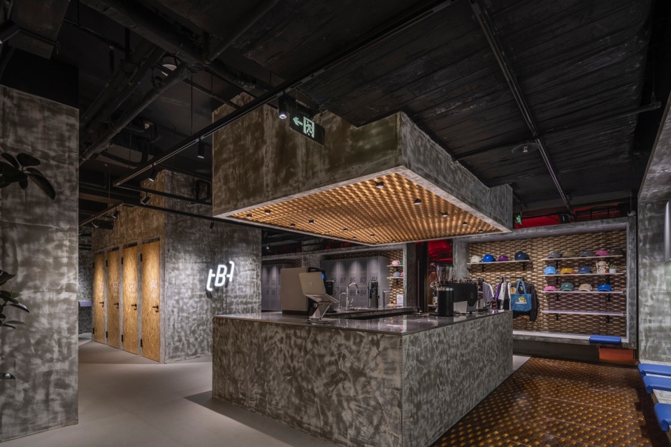 In the design of public areas, we deemphasized the functional nature of traditional fitness spaces. Flexible volumetric divisions create a smooth and relaxed flow, allowing people to feel at ease while they walk their way through the space, linger, or interact. The exposed ceiling structure, seamless materials, and cozy furniture create a relaxed, restful atmosphere. Some materials from the original store were taken into account and reintroduced in the new space: gold mesh panels are sealed with resin, cut and spliced to shape the floor, ceiling, and storage backrests; particle board removed from old cabinets becomes new shelves and backrests. These “old elements” are integrated into the space in a new way, not out of nostalgia, but to rediscover the warmth of familiarity. A functional bar counter and open lab area enhance the interactivity of the store and provide patrons with a richer and more diverse user experience.