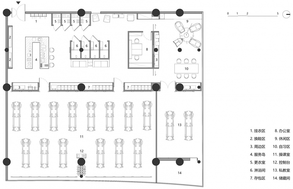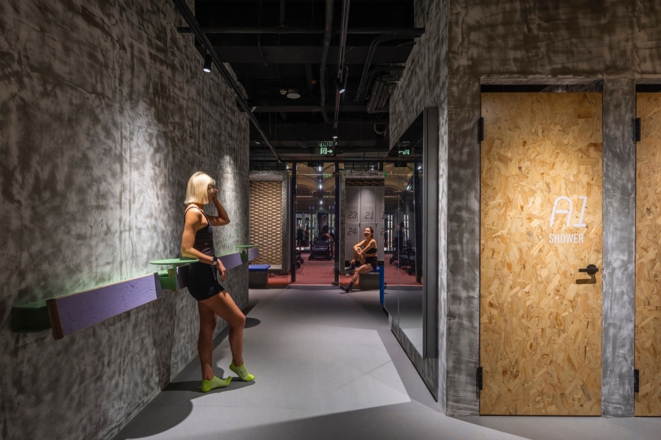 Tension between relaxed, nonchalant public areas and solemn, “purposeful” workout rooms creates a richly layered whole. The final aim is to provide patrons with rewarding emotional experiences—feelings of liveliness and openness, as well as of serenity and strength.