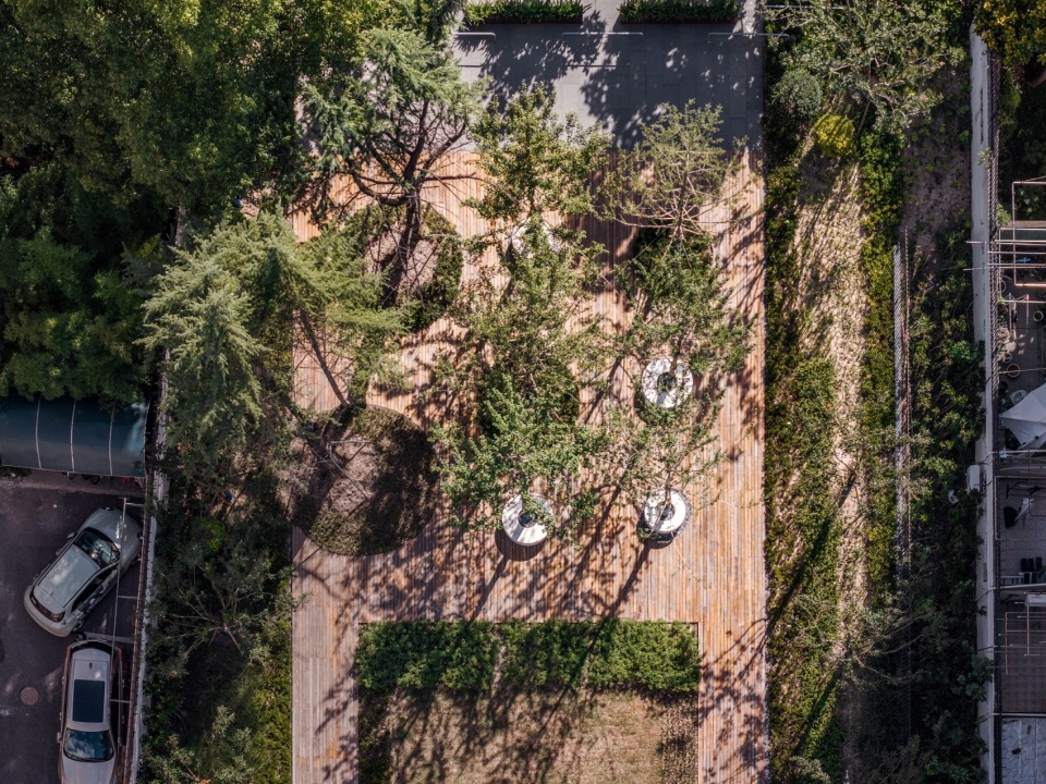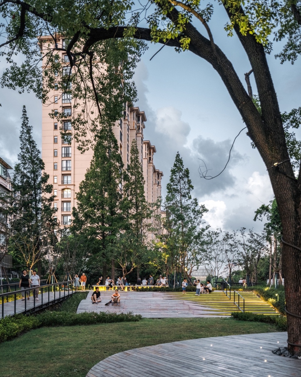 2. The highest platform utilizes preserved and new trees to define distinct subspaces for various small-scale social interactions, associating specific activities with different spatial characters.