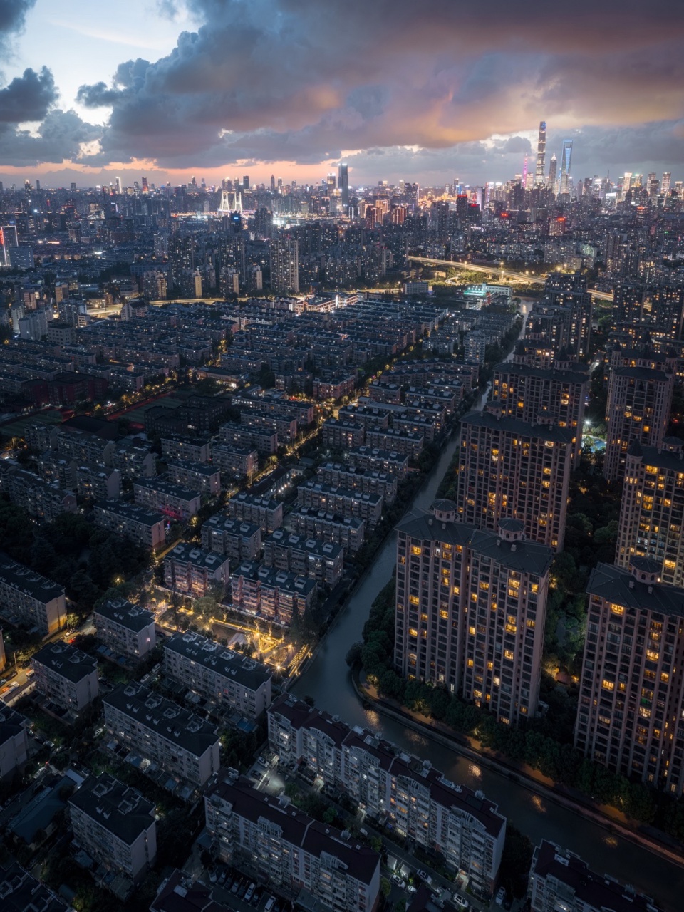 Aerial View of Deck Garden, Youyou Community, and Lujiazui Nightscape