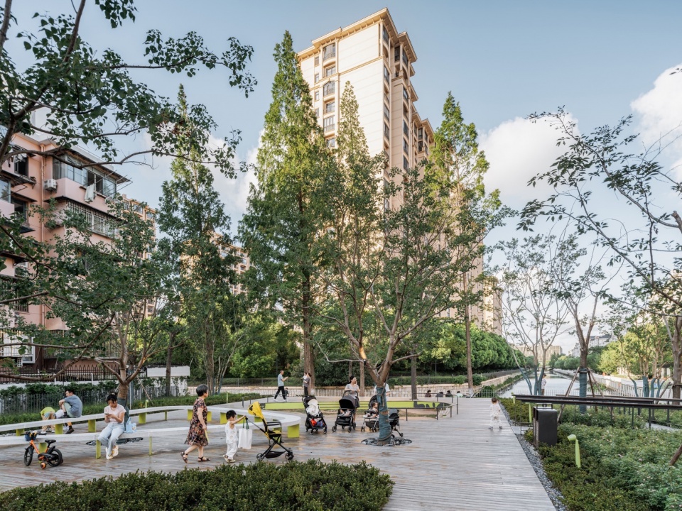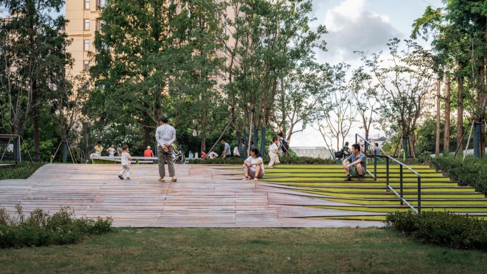 于是,我们在设计中将邻近浪水浜的甲板局部抬高1.5米,并结合现场保留大树形成一个容纳不同形式交往活动的“起翘的甲板”。在这里,由由社区居民可以站在与河对岸高端住宅小区居民几乎相同的城市空间标高上赏景休憩,形成使用者感受上的“蓝绿融合”。也可以沿浪水浜向东看向不远处的浦东图书馆等近年新建地标建筑景观,向北远眺6公里外的世界级城市景观“陆家嘴三件套”,令由由社区居民可以在家门口近距离与上海的城市发展同频共振。