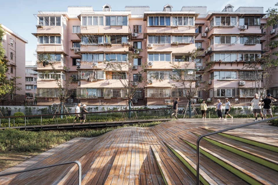 Consequently, we elevated the deck adjacent to Langshuibang by 1.5 meters. on the elevated deck, residents of Youyou Community can enjoy the view and relax at nearly the same level as residents of the high-end residential complexes across the river. They can also gaze eastward along Langshuibang towards new landmarks like the Pudong Library, or look north to the skyline of the “Three Iconic Towers of Lujiazui” 6 kilometers away. This allows Youyou residents to resonate with Shanghai’s urban development within their neighborhood.