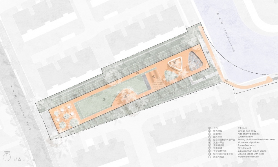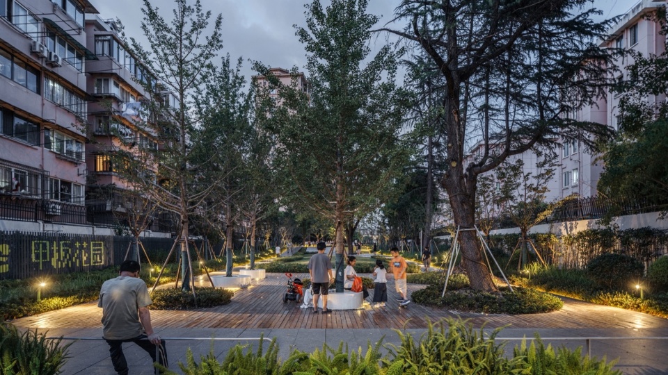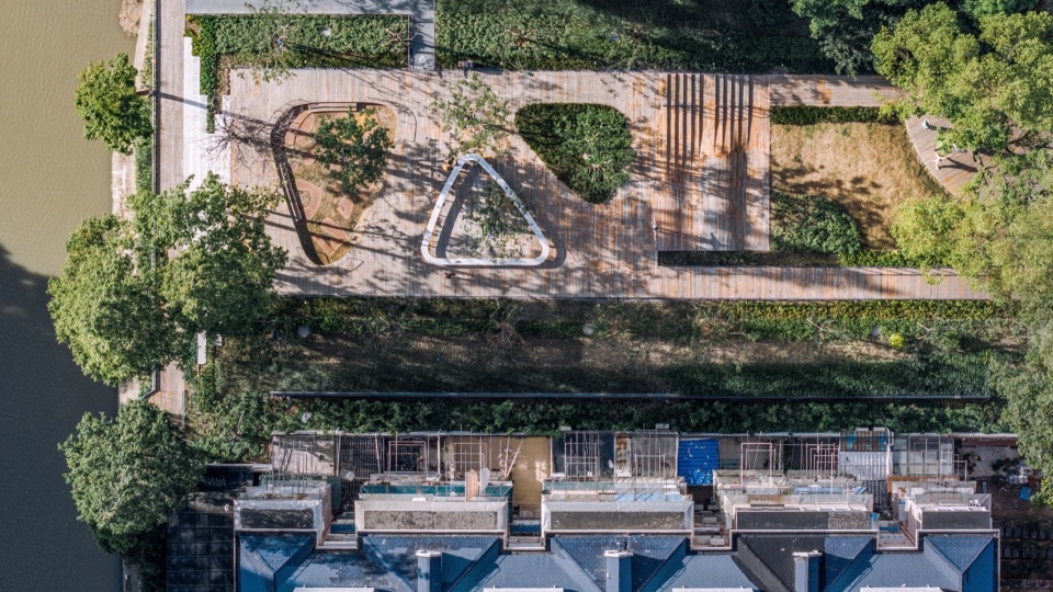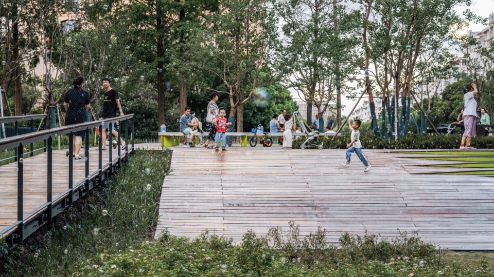 因此,我们在开始这个“社区花园/口袋公园”设计之初,就放弃了传统“花园/公园”设计中多层次空间结构设计的手法,同时也放弃了传统或主流景观意义上“造景”的动机,转向更简单直接的表达。在移除绿地围墙的同时,开门见山的植入一块完整的东西长90米、南北宽15米的“甲板”,以此作为社区公共空间最大程度共享的提示和隐喻,为居民提供开放、连续完整、尺度放大的绿色公共空间体验。并在最大限度保留保护现场大树的前提下,结合场地周边住宅、道路、河流的相邻关系,聚焦这块“甲板”在不同位置的使用功能与作用进而展开具体设计,并将本项目命名为“甲板花园”。