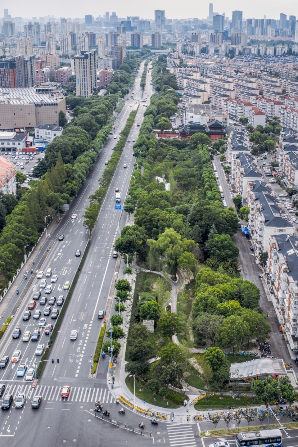 ▼从高科西路市政人行道看向“15分钟社区漫步圈”,View toward “15-Minute Walking Circle” from Gaoke West Road Municipal Sidewalk
