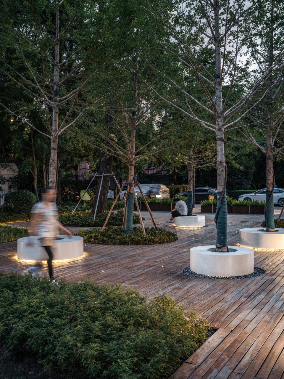 Secondly, to encourage recreational activities and provide casual resting points, a group of integrated benches was installed at the west entrance along Yanzhong Road. This utilizes preserved cedars and newly planted trees, extending the garden’s relaxed atmosphere into the street front.