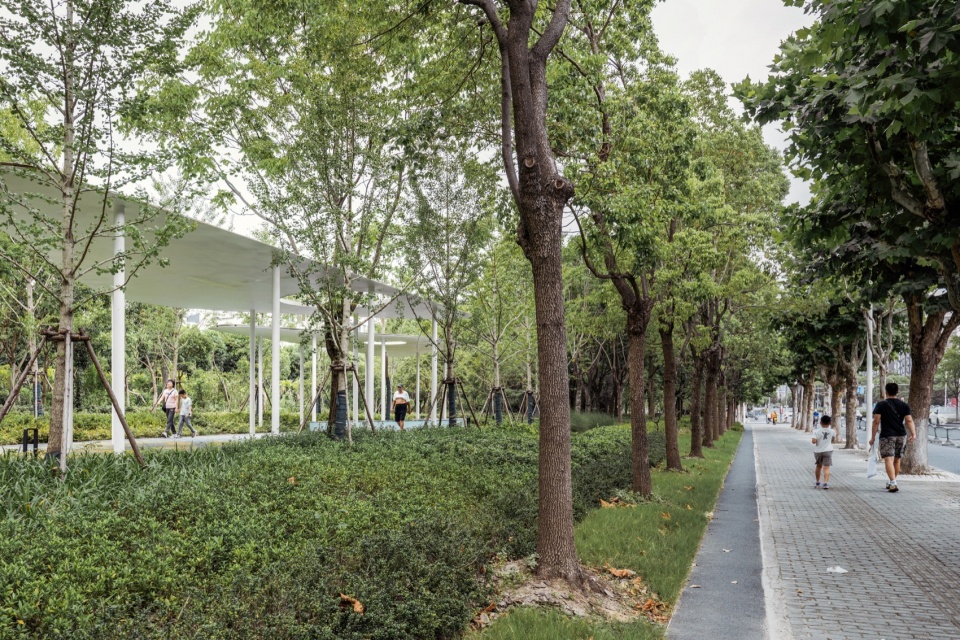 就规模、功能与景观特征而言,甲板花园是一处面向社区服务的“口袋公园”。而甲板花园的设计方案中关于中心城区高密度老旧社区的绿色公共生活方式与面对社区外部城市公共景观“风景平权”追求的表达,却让甲板花园这个口袋公园成为更大范围内为由由社区居民提升社区环境友好度的契机和引爆点。在2021年9月甲板花园方案通过各方审议后,为更好的完善与提升社区居民到相邻交通设施4、文化设施5的可达性与便利性,设计团队与业主团队共同策划了由由社区南片区“15分钟漫步圈”:一个以甲板花园为起点、总长约1800米的无障碍漫步环。并以“15分钟漫步圈”为线索建构沿线公共景观空间系统,完成滨水步行断点打通、现状非机动车停车空间梳理优化、游赏型步道与通勤步道的分型与融合、沿线幼儿园入口区域等候环境提升、城市防护绿地林下空间优化、小尺度景观游憩场所与设施植入等一系列小而美又具有系统性的设计工作。