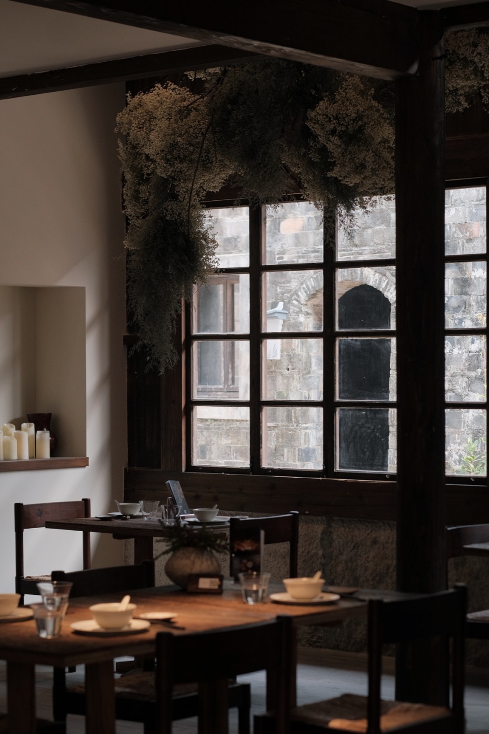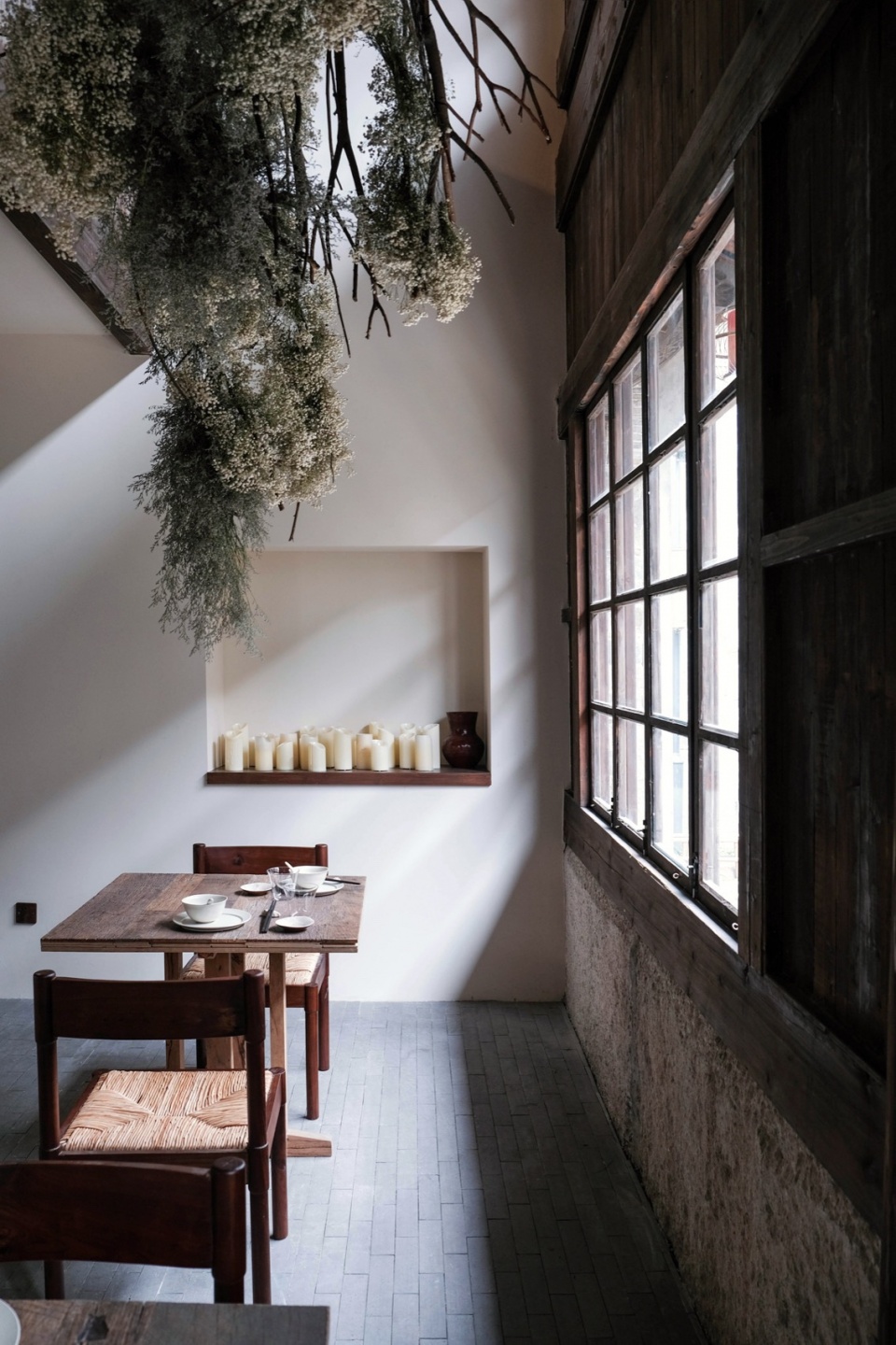 In the double-height space east of the dining area, a floral art installation hangs, visually linking the two floors. Occasionally exposed original structures in the new walls and ceiling hint at the building’s past. The staircase in the reception area leads to the second floor, which features twenty main hall seats, two small private rooms, and one large private room, offering diverse dining experiences. The layout maximizes natural light through the original windows while providing elevated views of the courtyard and the alleyways of street.