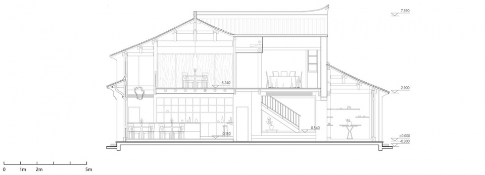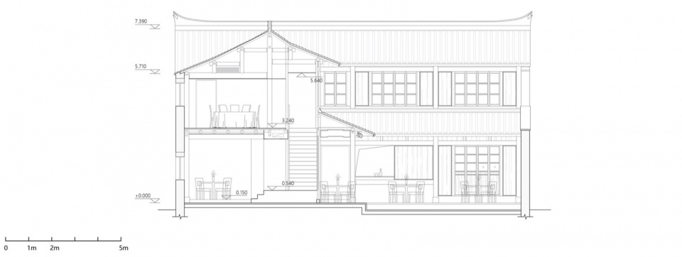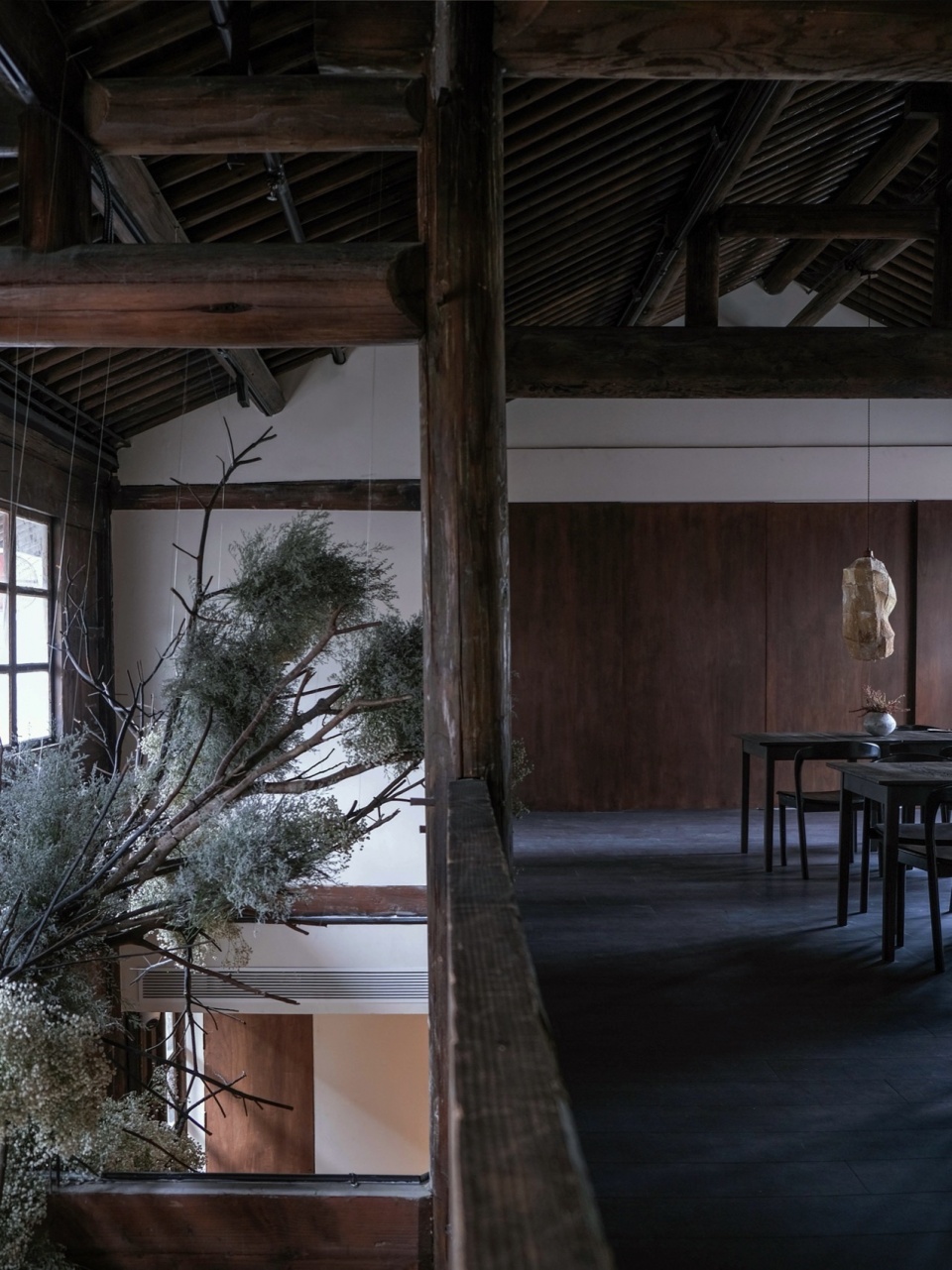 用餐区东侧的通高空间悬挂了花卉艺术装置将两层之间的视觉联系起来。新建的墙与吊顶中偶尔暴露出的原始结构,暗示般叙述着老房子原本的样貌。会客厅处的楼梯则可继续上到二层,二层设有二十个大厅座位,两个小包厢与一个大包厢,提供了多样的用餐空间体验,并充分利用原有的开窗来合理布局进行采光,也能从高处观看庭院与葭沚老街的巷道。