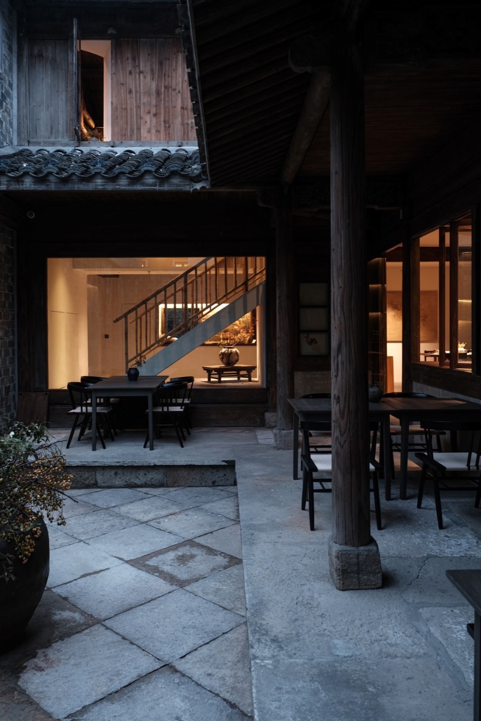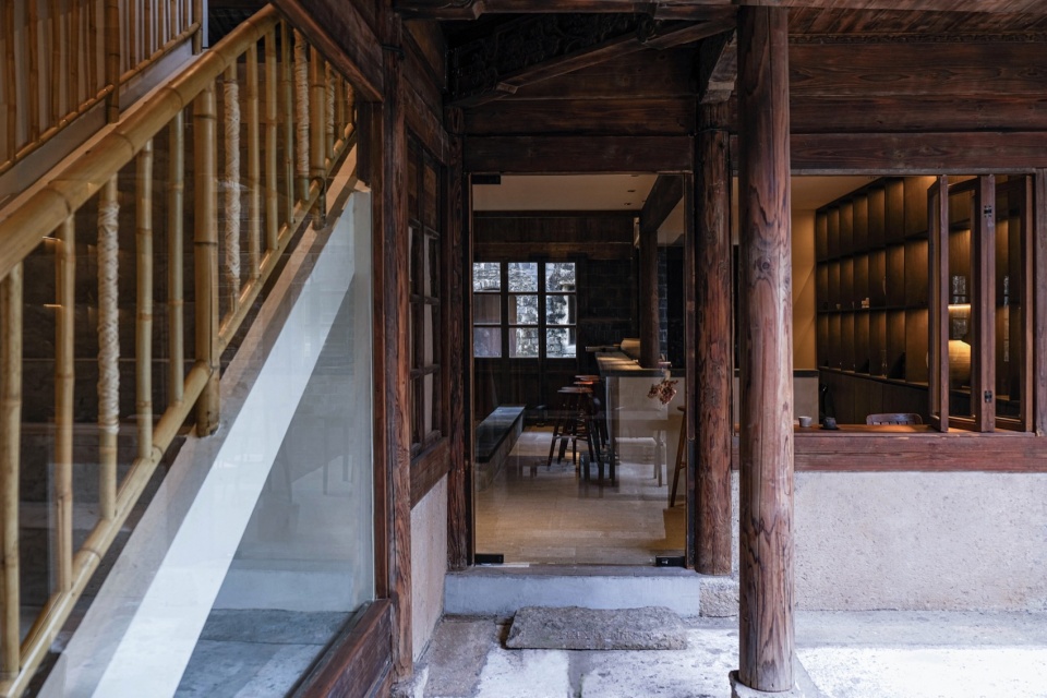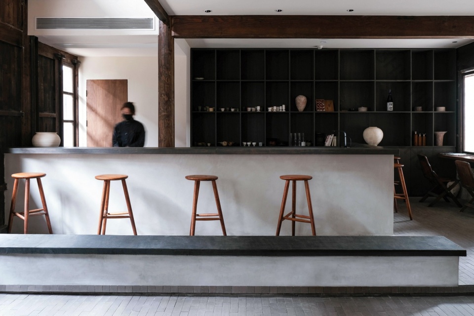 Passing through the ground-floor reception area, guests arrive at the dining zone, where the floor level rises once, then again near the bar, creating a dynamic, ascending rhythm. The courtyard entrance is positioned by the window next to the bar, marking the end of the public area’s flow on the first floor. The eaves corridor facing the courtyard serves as a semi-outdoor dining space and occasionally hosts artistic performances. In the second phase of renovation, the original stone-paved courtyard was transformed into a moss landscape garden.