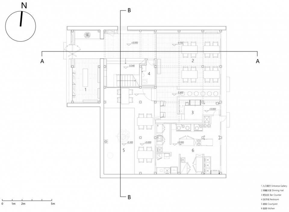 穿过一楼的会客厅,进入到用餐区域,地坪在这里进行了一次抬高,转向吧台一侧时地坪进行了第二次抬高,使得室内形成转动升起的节奏。庭院的入口最终被设置在吧台旁靠窗一角处,作为一层公共区域流线的结尾。面向庭院的檐廊除了可以用作半室外的就餐之外,有时在这里还能欣赏到院子中进行的艺术表演等。庭院也在二期的改造中,由原本的石板院子,升级成了一个苔藓景观庭。
