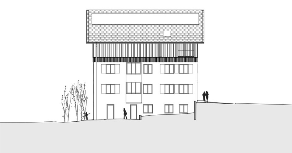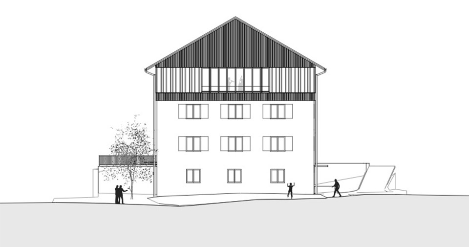 The existing roof will be removed for the extension of the existing municipal office and replaced by one storey, mainly in timber construction. The newly created roof supplies the building and the electricity grid with a PV system.