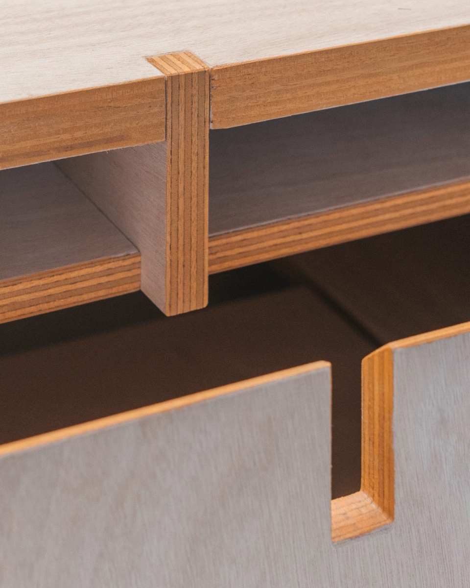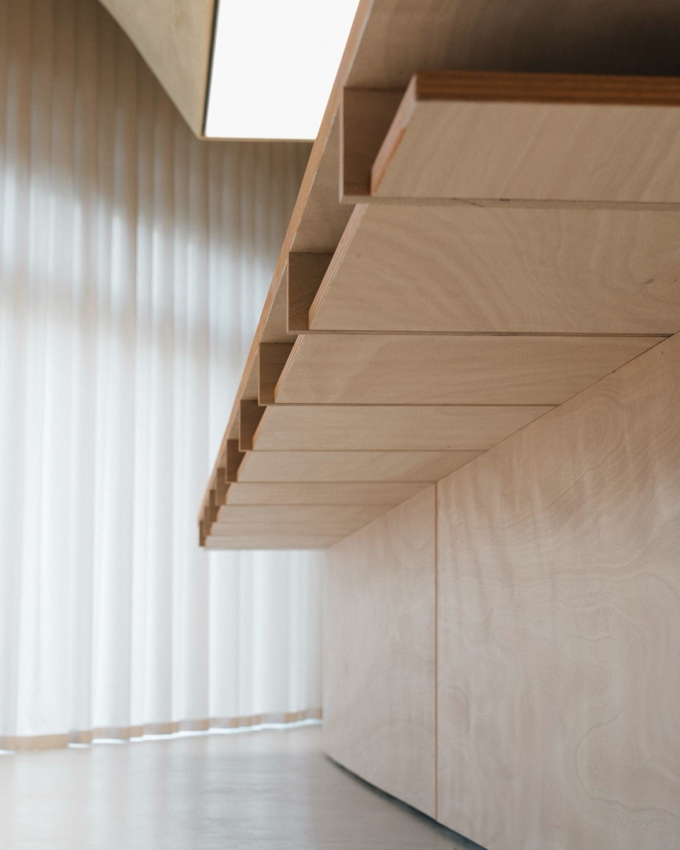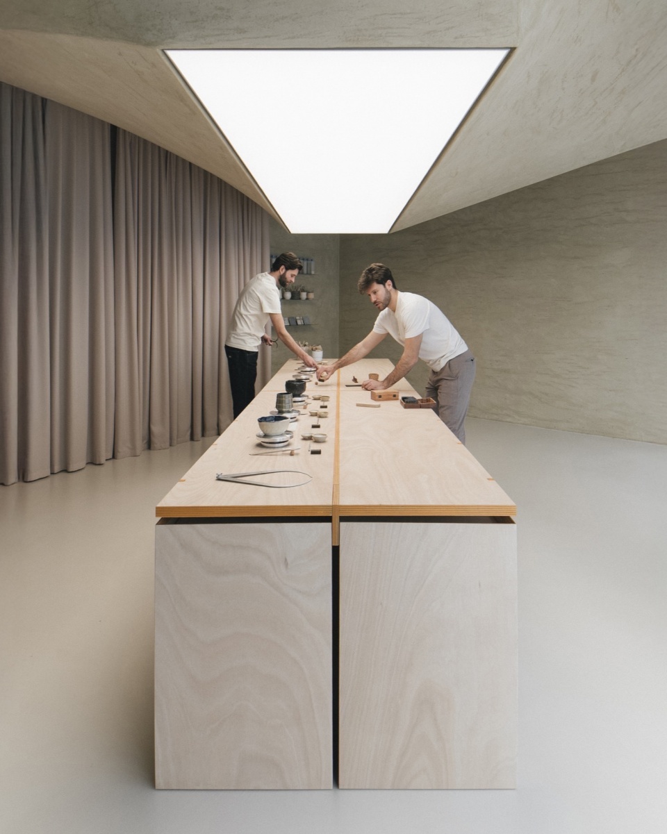 当椅子被收起,桌子本身便成为“建筑中的建筑”:由奥古曼胶合板制成的纤薄台面仿佛悬浮在空中,由一系列“T”形框架支撑,如同悬臂梁般挑战着重力。