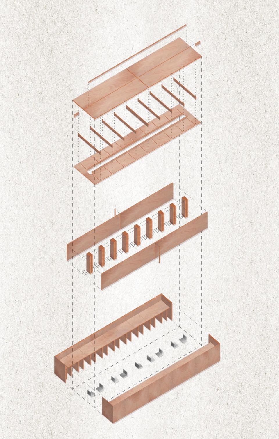 Stripped of the seatings, the table presents itself as an architecture within architecture, a slender top of okumé sheets almost suspended in the air, supported by a series of’T-frames, like cantilevered beams that defy gravity.