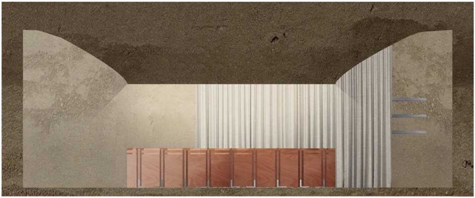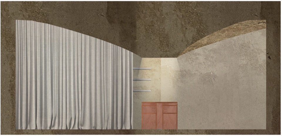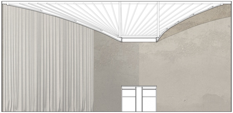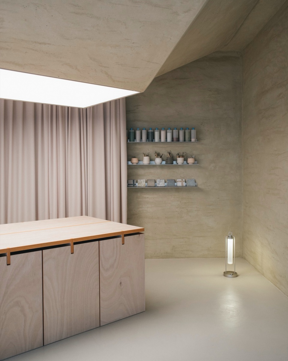 The form is shaped like clay on the potter’s wheel, molded twisting from the ceiling. The space is tensed by the centripetal force of the design gesture, concentrating the atmosphere around a single zenithal light.Like a sacral element, perfectly aligning with the lamp that pierces the stereotomic shape above, a seemingly monolithic exhibit altar diagonally stands out in the space.