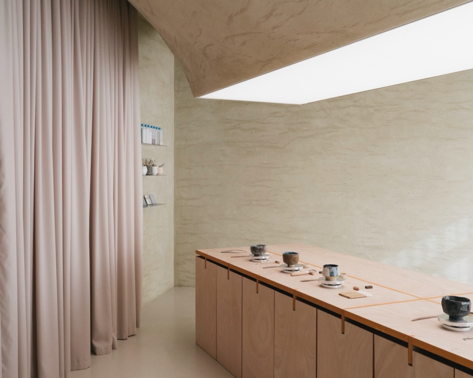 如果说台面的材料回应了和面操作的实用需求,那么墙面与天花板的肌理则具有象征意味。由黏土与制砖废料组成的夯土抹灰,象征着赤陶生命的循环本质,传达出持续再利用与回收的理念。