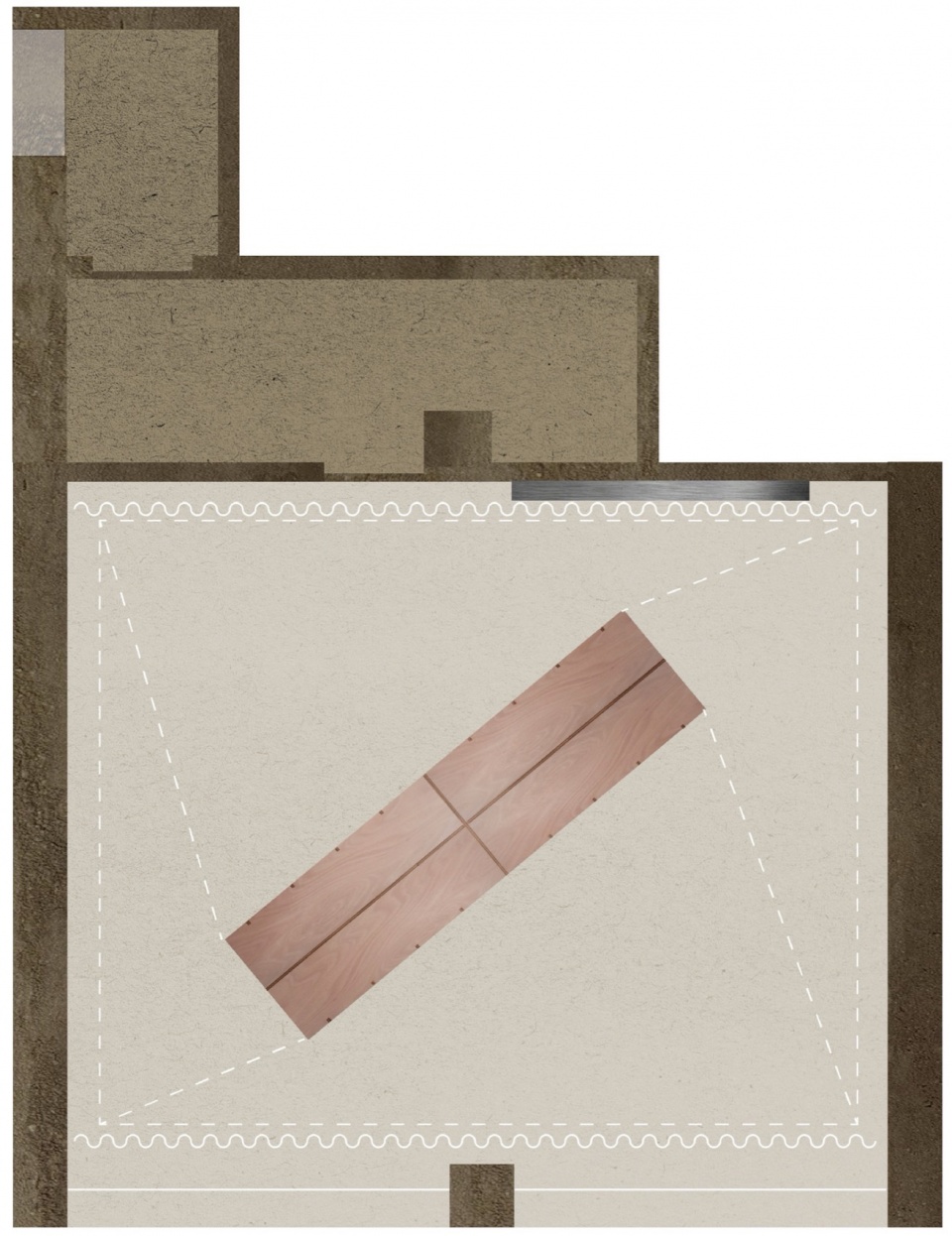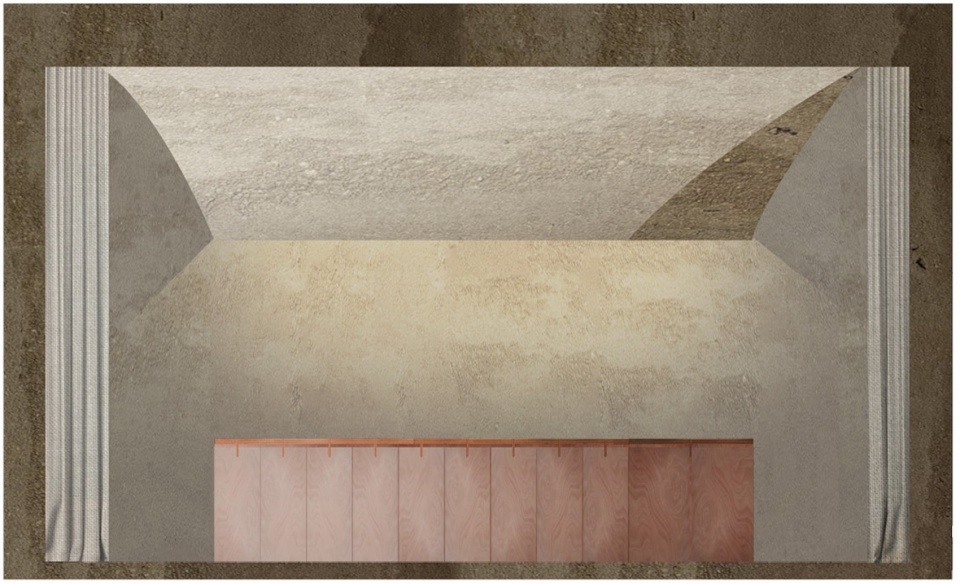If the top surface material responds to practical needs for dough workability, the texture of walls and ceiling is symbolic. The rammed-earth plaster, composed of clay and brick production waste, represents the cyclical nature of terracotta’s life, looking at continuous reuse and recovery.