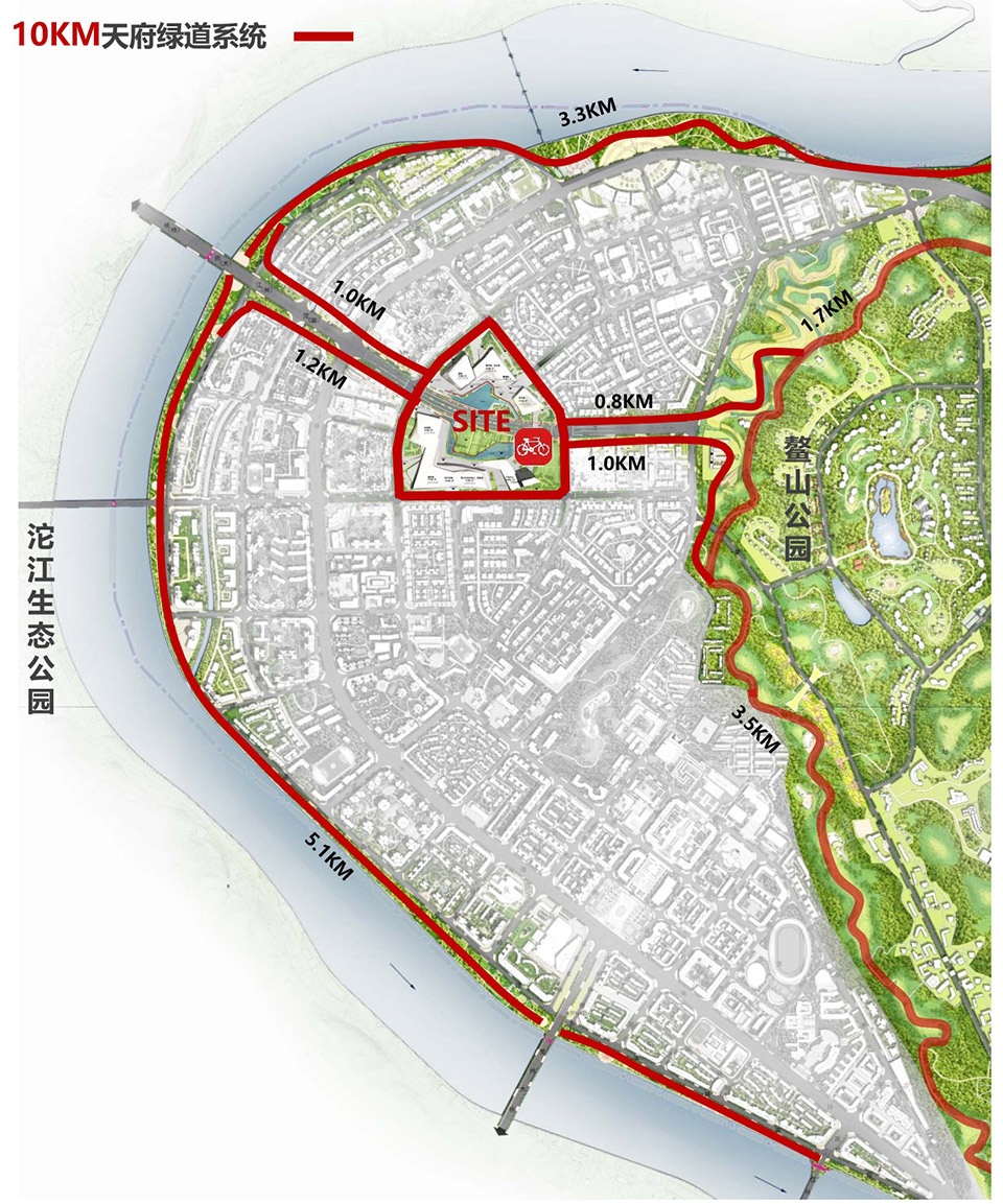 设计秉承”公园城市”的规划理念,将项目有机嵌入成都市天府绿道网络体系,实现与沱江滨江公园、鳌山公园的景观连续性。通过构建总长10公里的分级绿道系统,统筹自行车骑行与步行尺度需求。绿道驿站节点采用均衡分布策略,形成完整的慢行网络覆盖,显著提升场所的可达性与空间趣味性,塑造具有持续吸引力的城市活力核心。