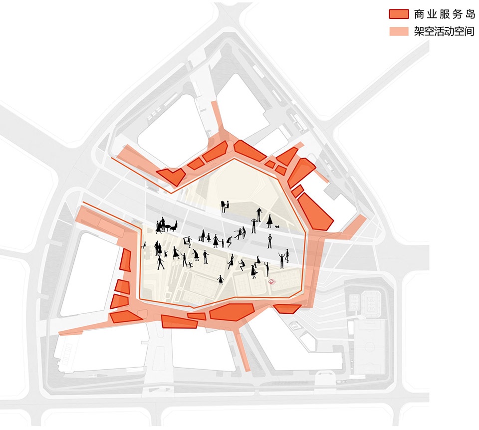 设计以6米标高架空活力环为空间主轴,整合南北区功能模块。通过将主要入口设于活力环层,将地面空间完整归还城市,形成连续的公共界面。释放出约5000平方米的完整地面空间,使城市公共活动自然渗透至建筑内部,形成全天候的城市活力场所。上部通过不同标高的室外阳台及屋顶花园建立体公共空间序列,既满足观演、休闲等复合需求,又创造了多层次的建筑体验。