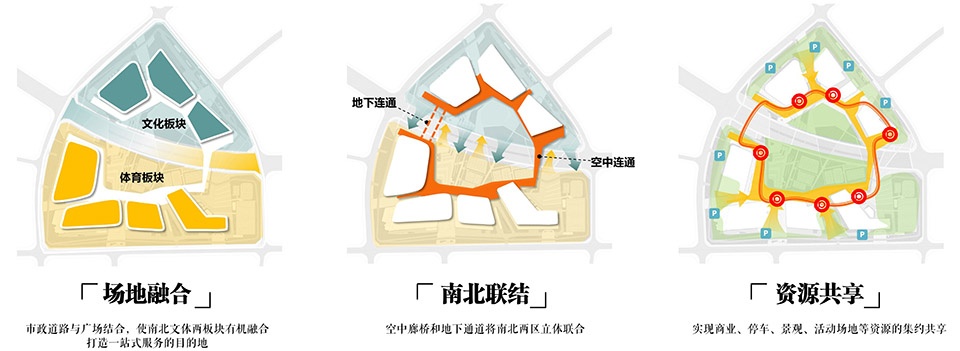 通过市政道路与广场的有机衔接,实现南北文体功能板块的空间整合。空中连廊系统与地下通道构成立体交通网络,高效串联商业、赛事、休闲、停车及景观功能,形成集约化、多元复合的文体综合体范式。