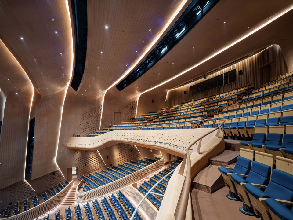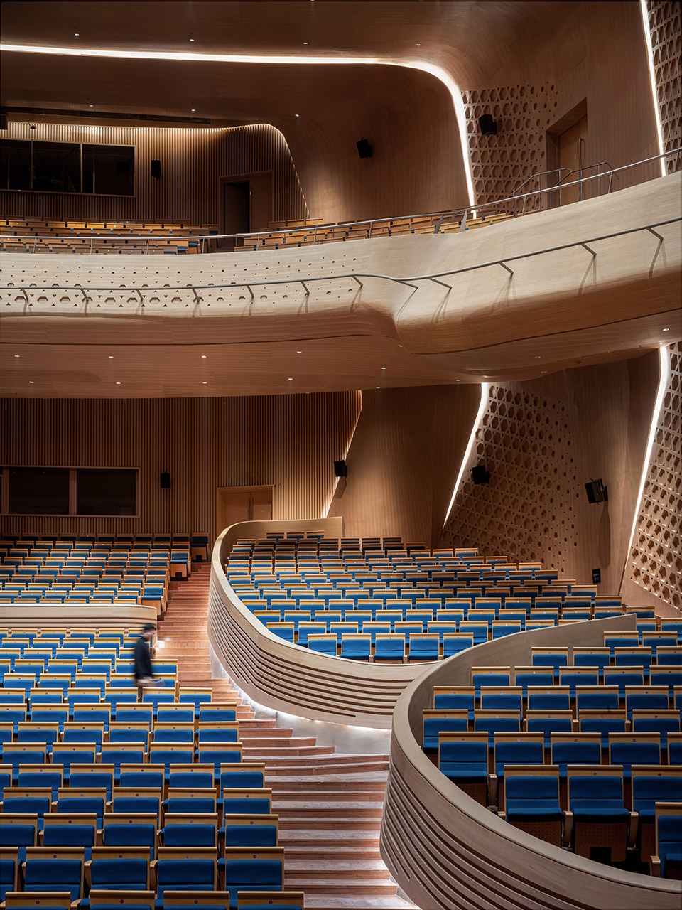 大剧院采用岛式包厢池座布局,通过单元化包厢的错位排布,打破传统观演空间的平面单调性,构建具有丰富层次感的立体观演体验。配套空间采用共享式布局:一层集中设置演艺功能区,实现音乐厅与大剧院后台资源共享;二、三层通过休息厅的空间串联,优化流线组织,显著提升空间使用效率。