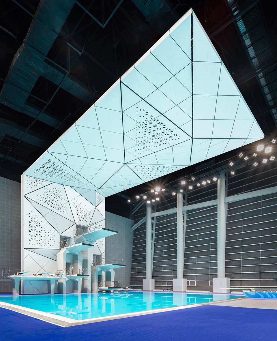 创新性地采用空间复合模式,使体育馆具备比赛、健身、演艺、展会等多场景转换能力。墙顶一体化的连续曲面造型,既满足功能共享需求,又实现形式与功能的统一表达。跳台采用清水混凝土整体现浇工艺,通过精细化施工控制,完美呈现材料自然肌理,同时解决色差、水波纹等技术难题,实现结构表现性与功能性的高度统一。