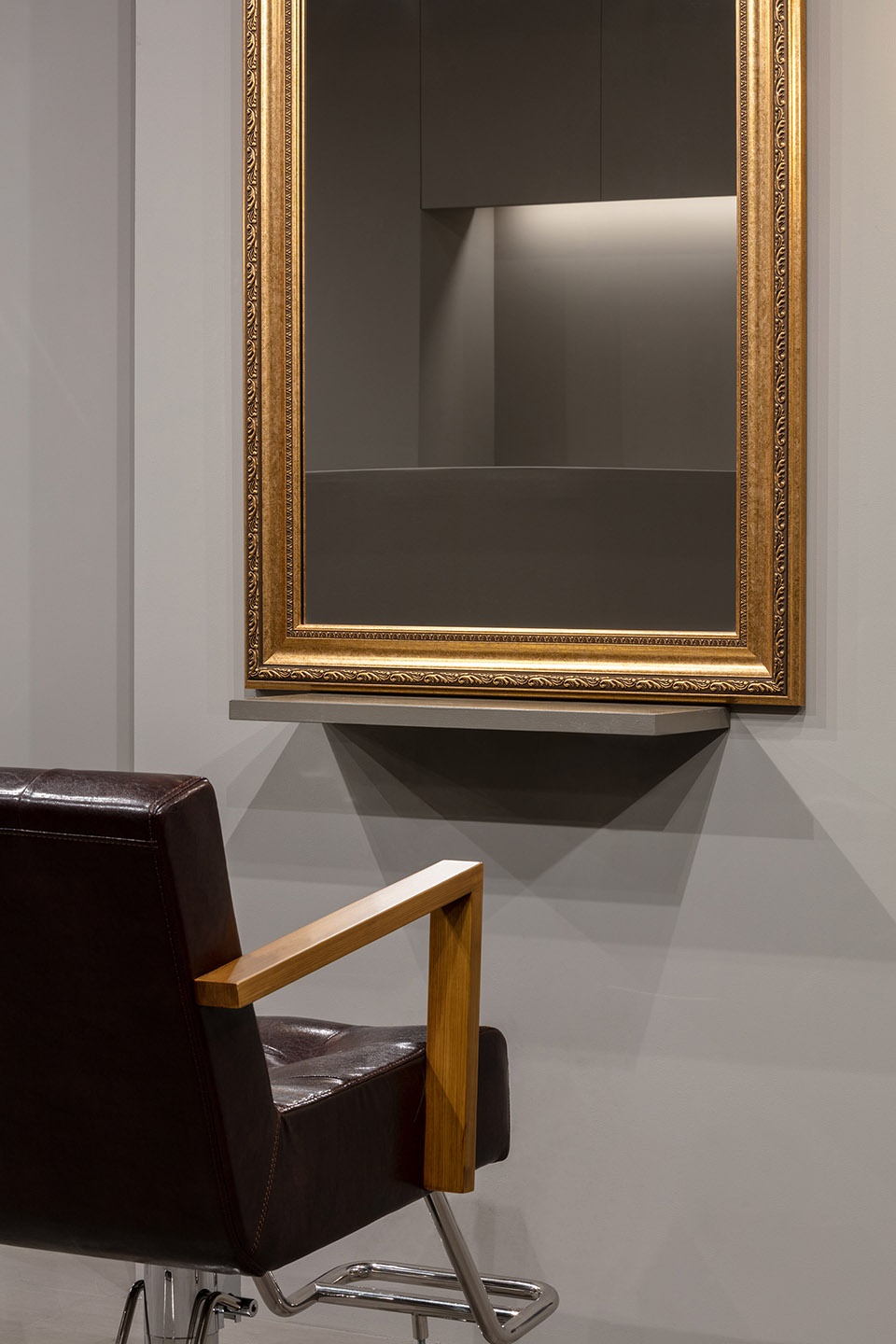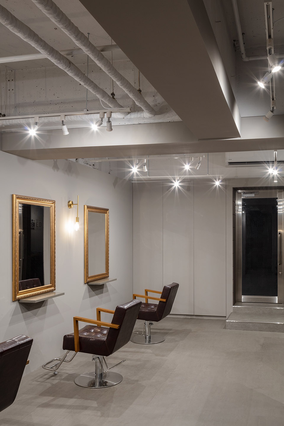 The interior is finished with simple paint; the façade, clad in tiles. Lighting is composed of spotlights fixed to a basic track system. Chairs and mirrors were selected in response to the owner’s preferences. The architect’s intent is distilled into the layout and minimalist detailing.