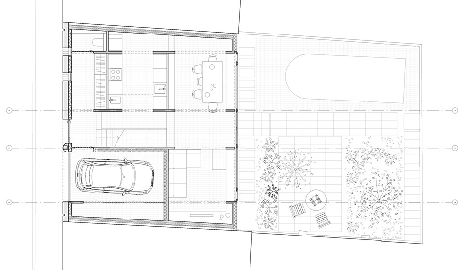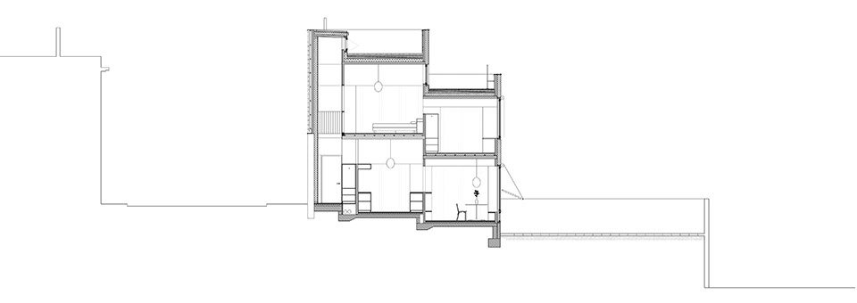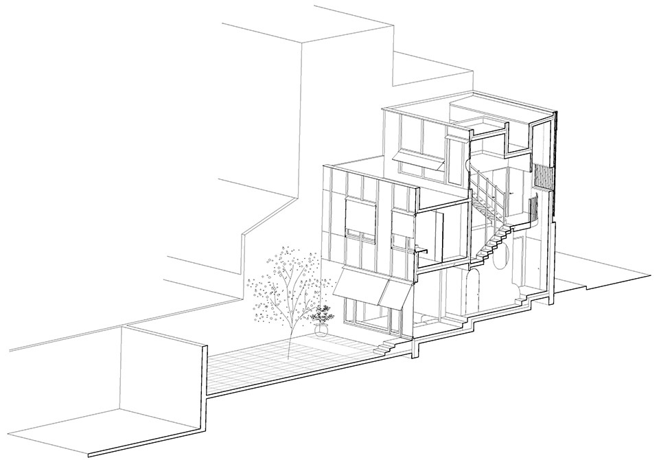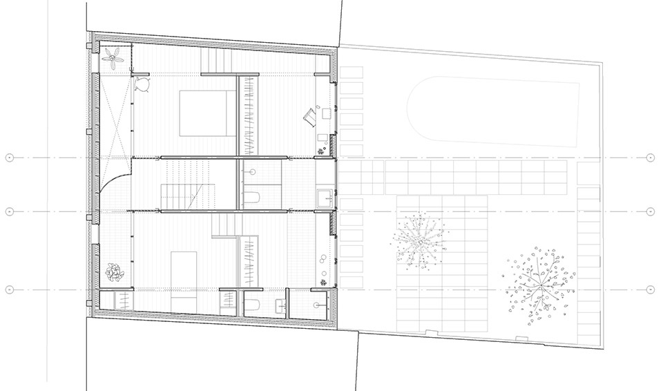 The topography of the entire area slopes continuously towards the sea, having to deal with level changes within the plot. There is a drop of 1.4 m from the street to the rear façade. The Split House progressively adapts to this level condition by stepping the ground floor, with a series of platforms of different levels, like a descending promenade, connecting the main street with the courtyard. This section is mirrored on the upper floor, composing two different levels that “split” the house, creating new facades where the light from the south is brought inside.