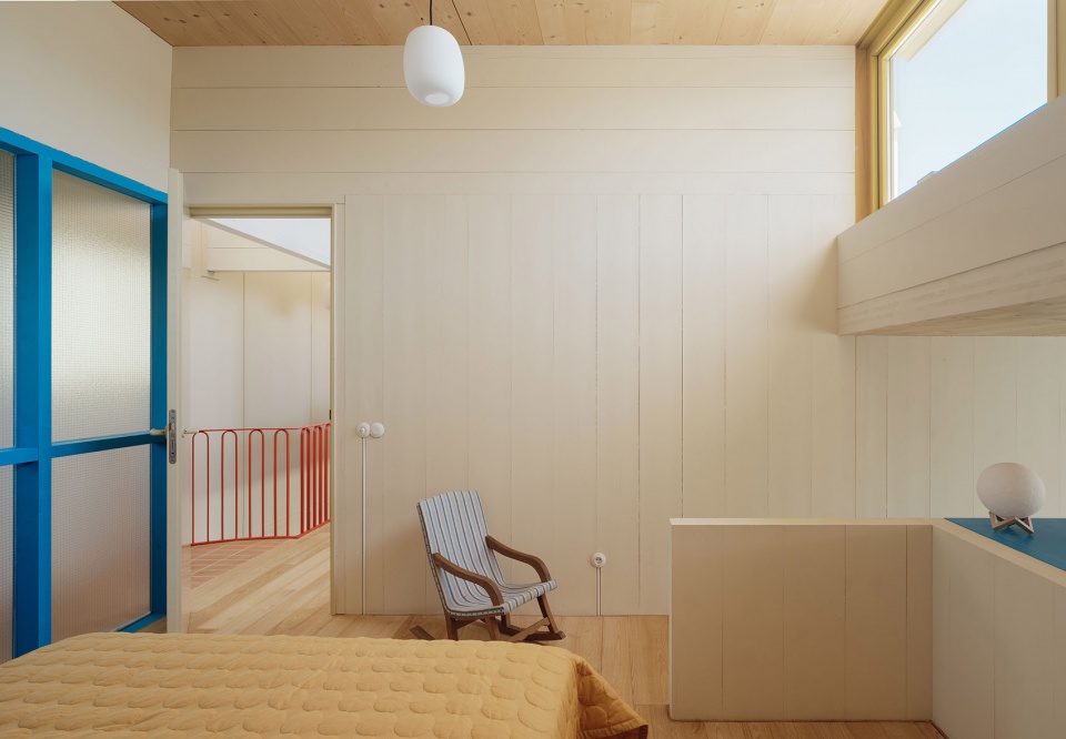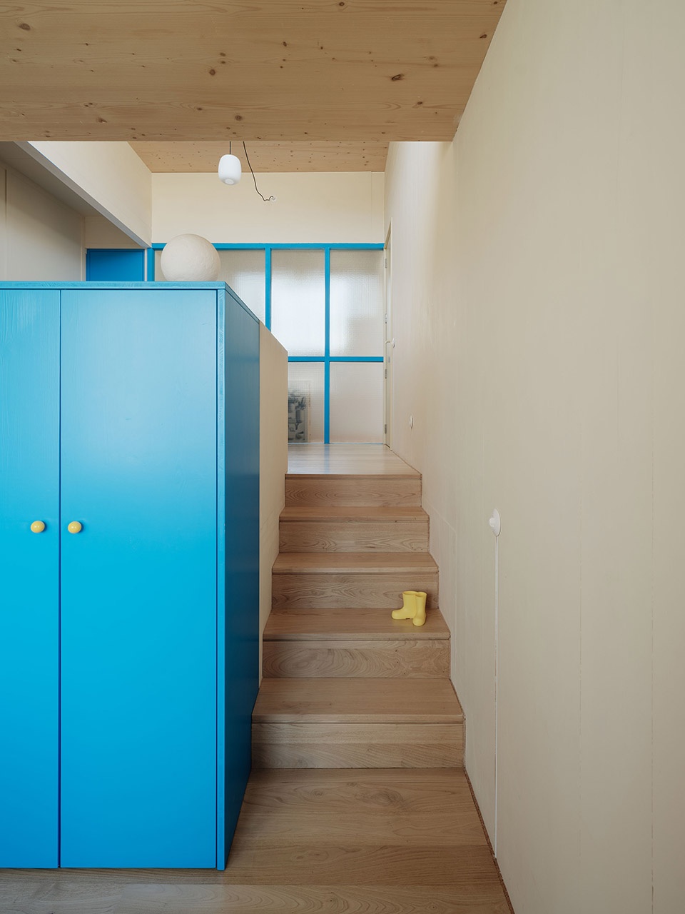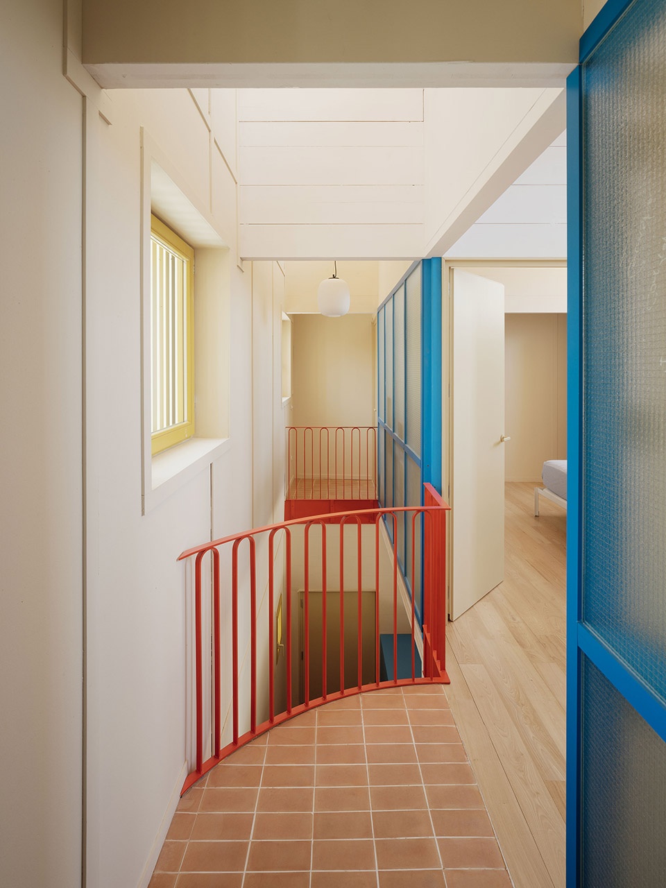 Most of the spaces are defined by an atmospheric “vainilla ice-cream” colour paint which covers the exposed timber while enhancing its texture. Other parts are complemented by the use of saturated color to emphasize certain corners and areas of the rooms. Colours are used as an extravagant filigree and are the result of a subjective preference chosen together with the client.