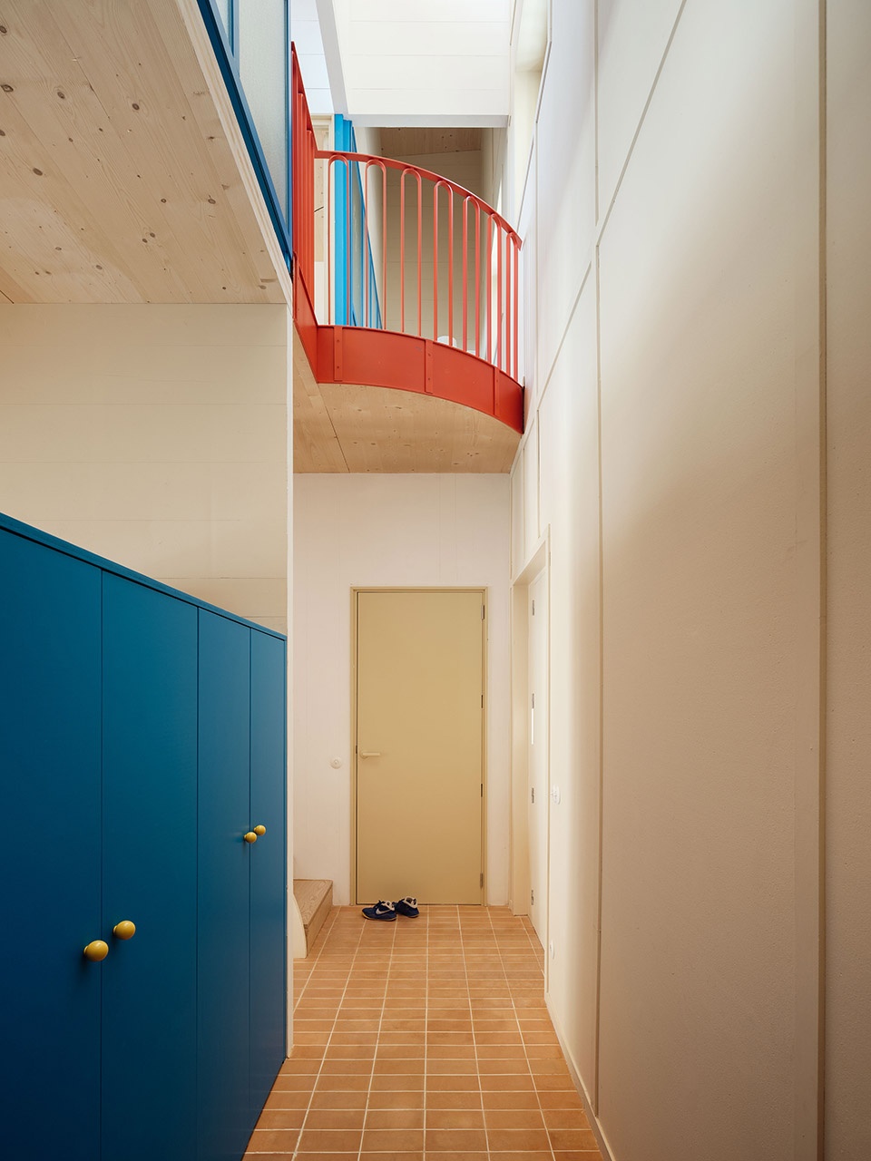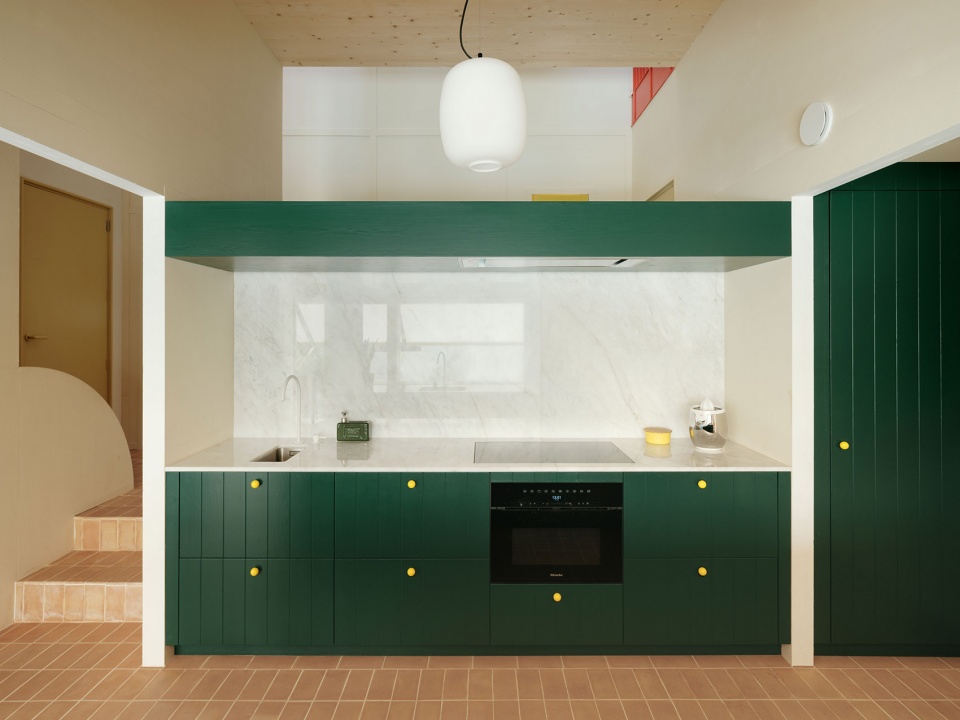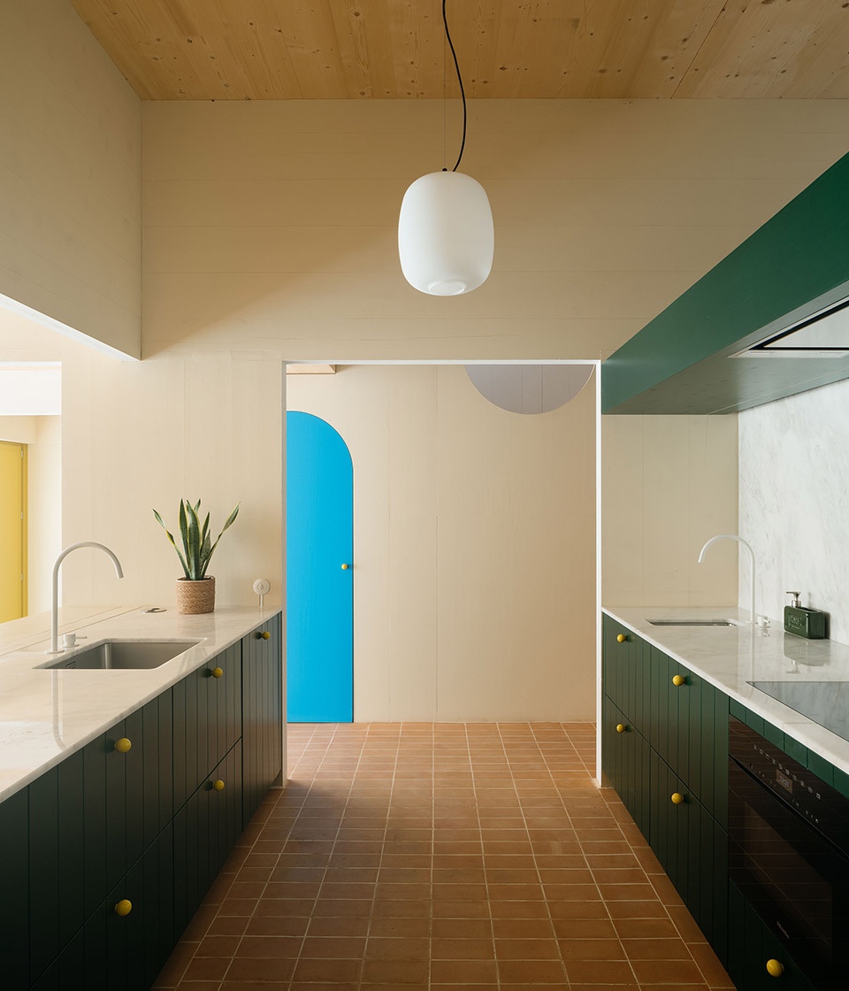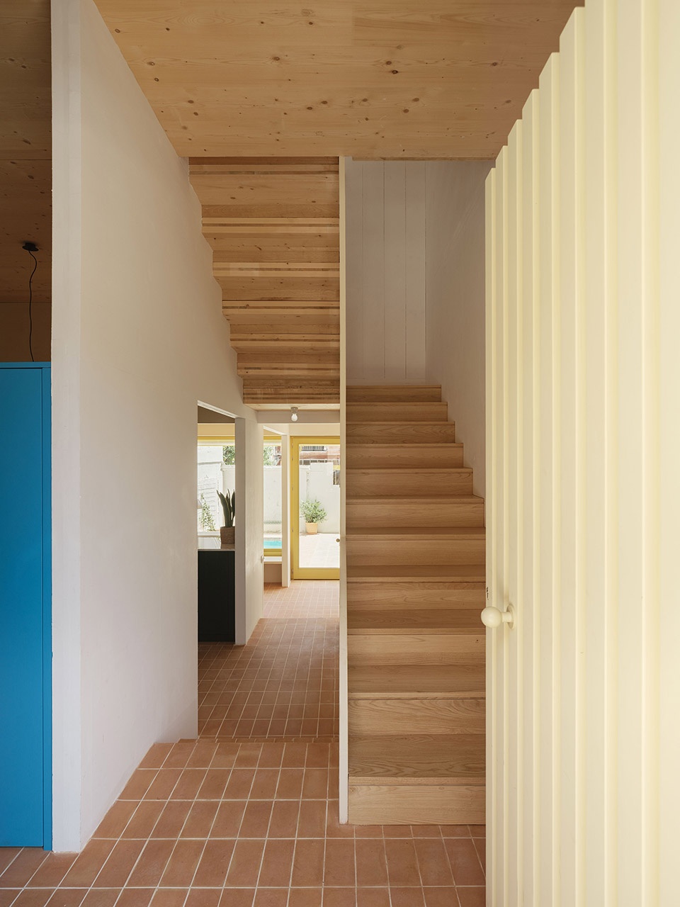 Most of the spaces are defined by an atmospheric “vainilla ice-cream” colour paint which covers the exposed timber while enhancing its texture. Other parts are complemented by the use of saturated color to emphasize certain corners and areas of the rooms. Colours are used as an extravagant filigree and are the result of a subjective preference chosen together with the client.