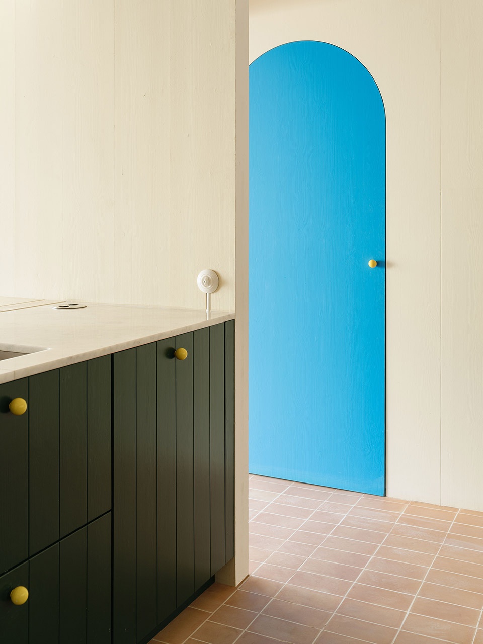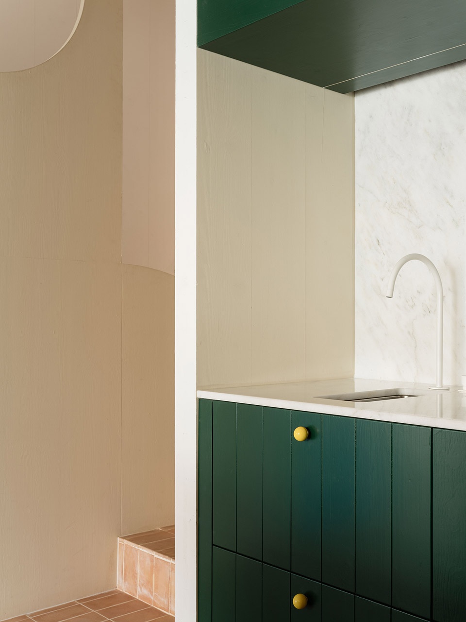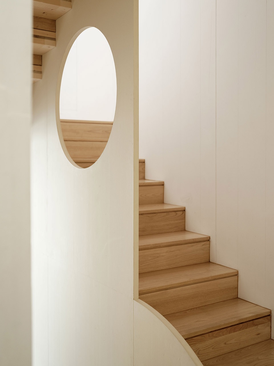 室内空间以“香草冰淇淋”色调为基底,覆盖在裸露木材之上,以凸显其肌理;同时在部分区域引入饱和色彩,作为点缀性的装饰细节,强调角落与特定空间氛围。整体色彩选择带有客户的个人偏好与设计师的主观表达。