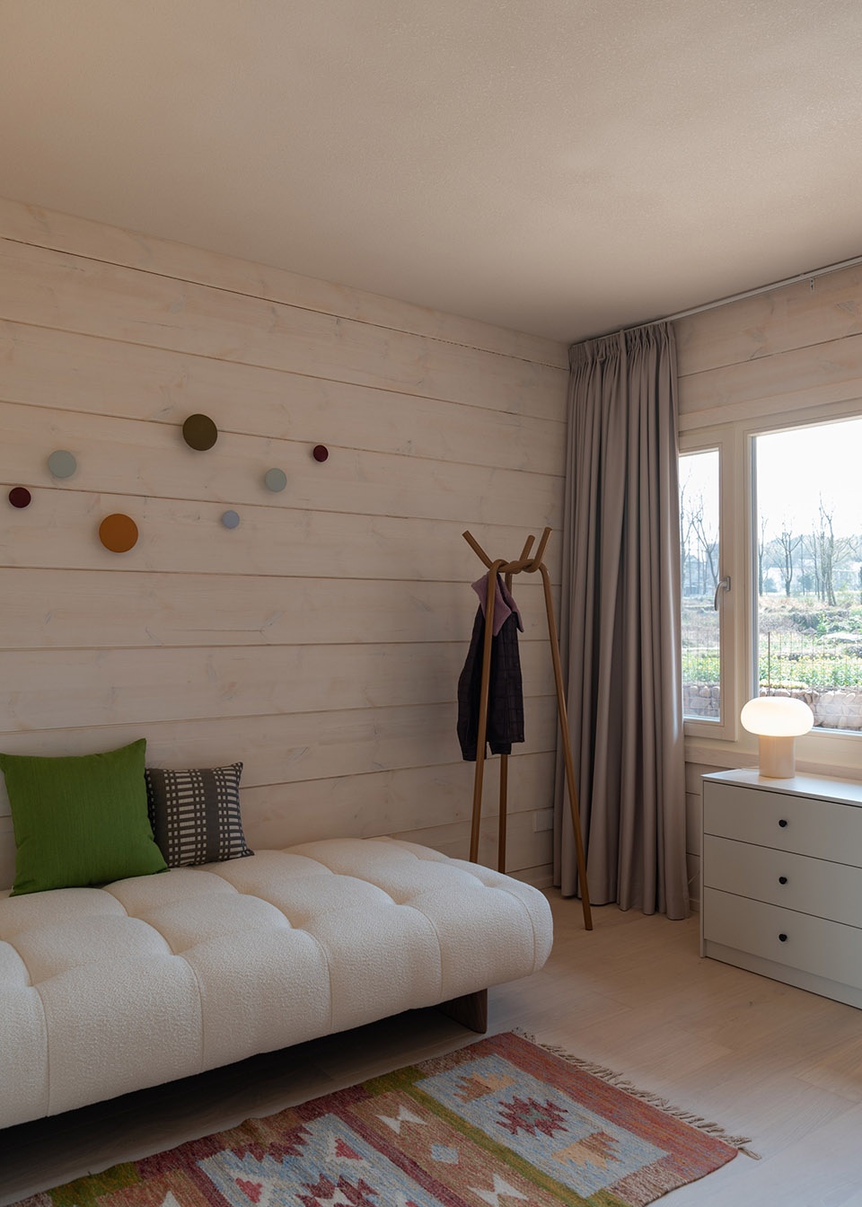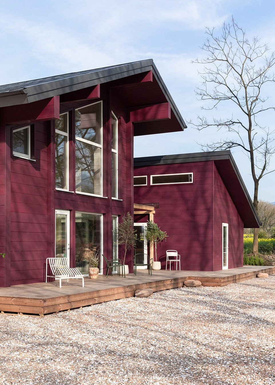 One-third of the original building, the livestock and toilet volume, was removed and replaced with a Glulam Log House—designed in Shanghai, prefabricated in Finland, and built in Jiangshan—intended as the owner’s private living space. A corridor threads through the architecture like a contemplative path, connecting old and new: on the far side, the old house was restored to accommodate guest rooms and family gathering spaces. A smaller timber extension—housing the kitchen and dining room—rests adjacent, surrounded by fruit trees and vegetable plots, and designed to accommodate flexible culinary rituals. The two timber volumes, unified by a raised thermal wood terrace, are painted in a deep purple—a hue favoured by the owner’s late mother, gently anchoring memory to place. The combination of handmade plywood furniture, soft tones of painted pinewood walls, and custom-made room furnishings make for a relaxing and warm home. Colourful accents and cheerful upholstery in the study and dining lounge, along with the lush green view, bring joys to everyday life.