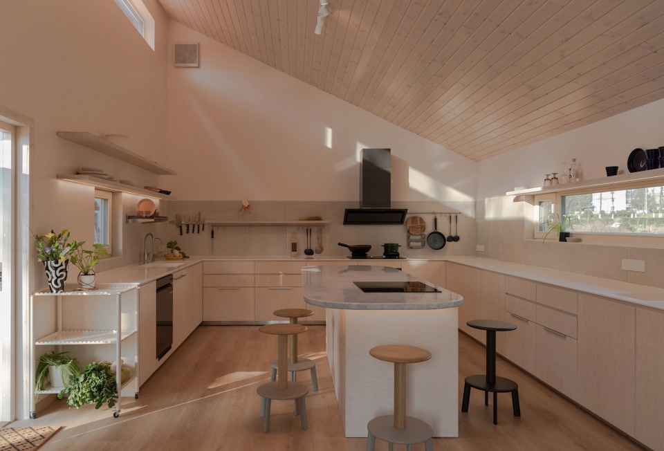 原建筑中牲圈和厕所的三分之一体量被移除,取而代之的是一座胶合木(Glulam)木屋——上海设计、芬兰预制、江山建造——作为主人的私人起居。一条廊道贯穿整栋建筑,冥想似的串联新旧空间:远端保留的老屋主体被修缮为客房与家族聚会的堂屋。毗邻木屋的较小木结构是主体木屋的延伸,兼具厨房与餐厅,四周果树菜畦环抱,定制的厨房布局宜于中西结合的多样化烹饪需求。两座木结构体量通过抬升的碳化木平台连为一体,深邃的紫调涂装源自主人已故母亲钟爱的颜色——记忆被轻轻的融于新居。手工打造的胶合板定制家具、柔和的木蜡油松木墙面与特别设计定制的软装搭配共同营造出轻松温暖的居家氛围;在书房与餐廊等空间,跃动的色彩与明快的布艺与窗外的绿意一起,带来愉悦的生活逸趣。