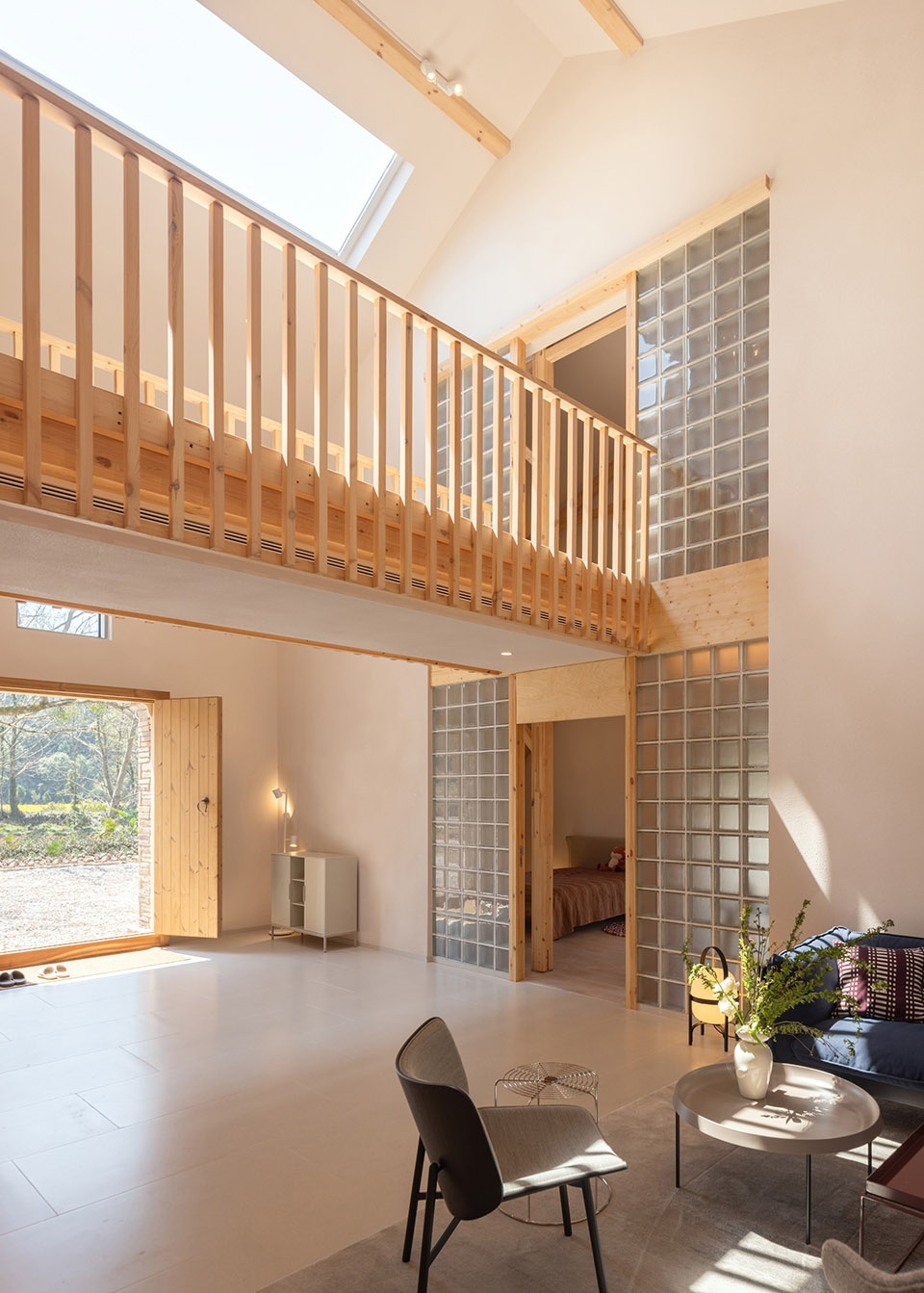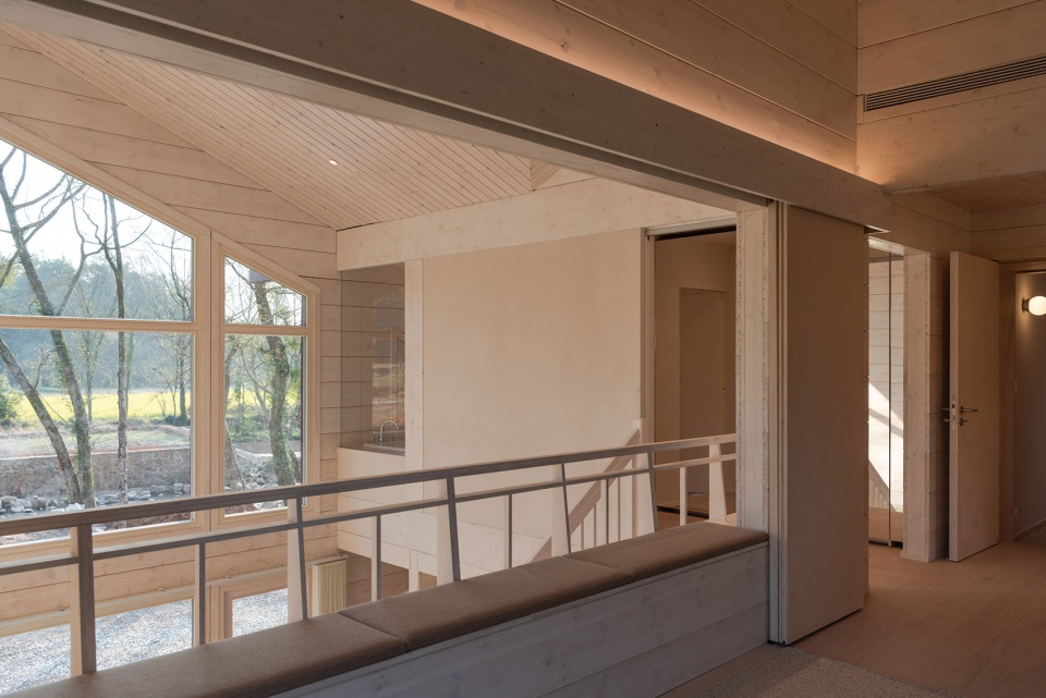 堂屋,木屋,餐厨,三座建筑体量均融入了传统中国院落住宅的基因,在各自的场景以不同的语言再现。主卧室的对开移门通向光线漫溢的中庭,将视线引向田野与溪流。经过重新演绎的「美人靠」轻倚其间,框取晚日与高林。早餐时分,远山轮廓与竹林群落化作一幅活态画卷——是对苏州园林「借景」手法的当代致敬。