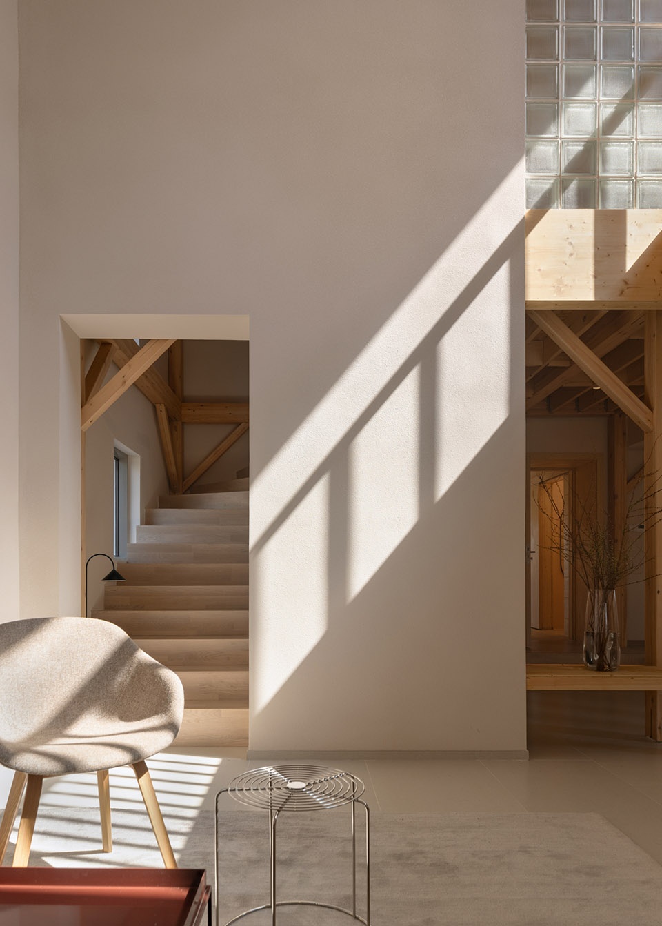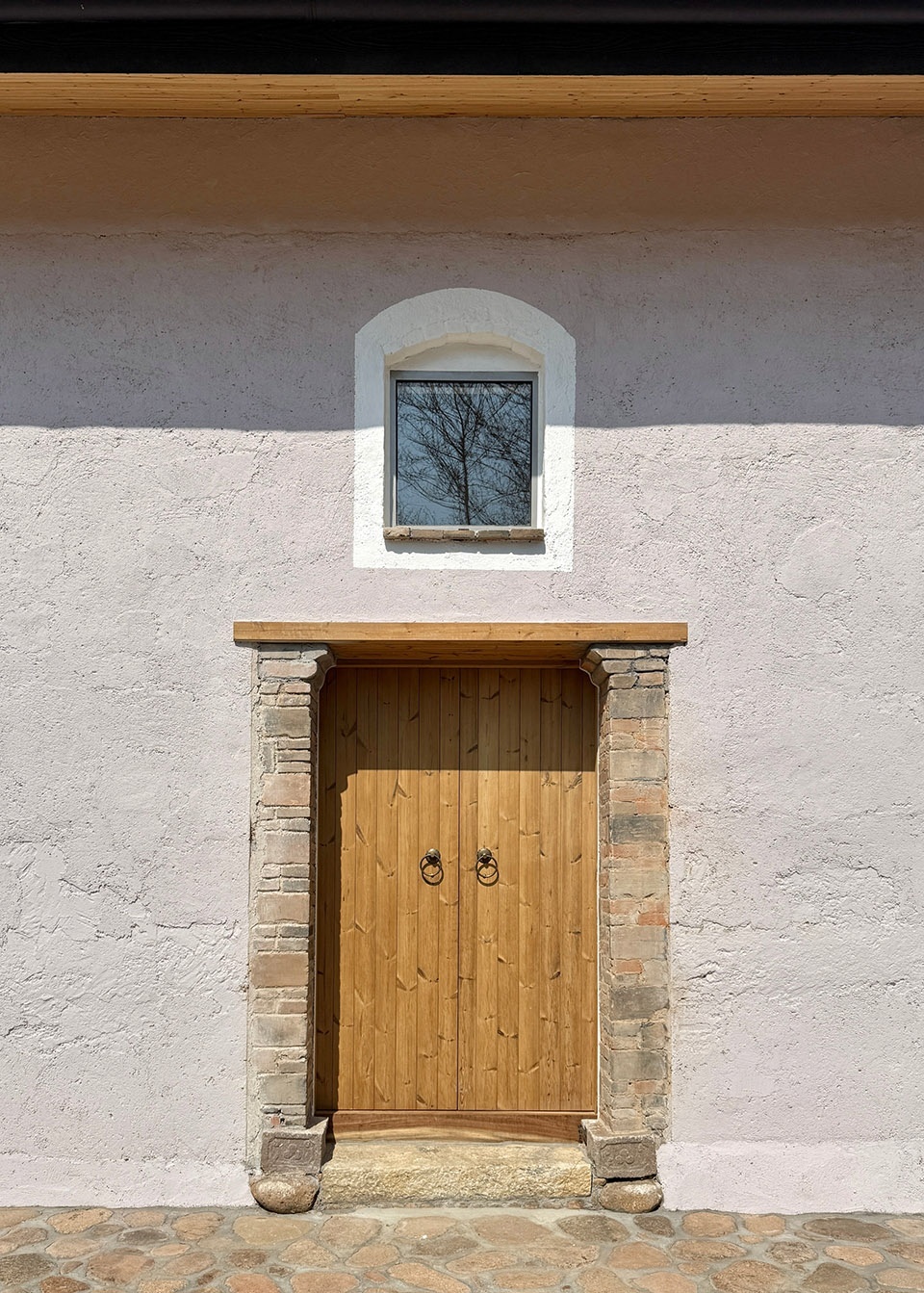 A new skylight now punctuates the central axis of the old structure, bathing the atrium in natural light. The spatial configuration has been carefully reorganized to resonate with its ancestral cadence for farming tools, while preserving the rammed earth walls—meticulously restored and finished with vernacular techniques. At the focal center of the hall, a segment of original rough earth wall has been artfully framed within a circular vignette, evoking the new life of the past. The entrance portal maintains its traditional exterior expression, while incorporating contemporary door frames on the interior face. Both doors and frames are crafted from thermal wood, accented with vintage-style wooden crossbar latches for closure. The glulam sliding windows, inspired by indigenous window traditions, serve as poetic mediators of daylight for the rooms.