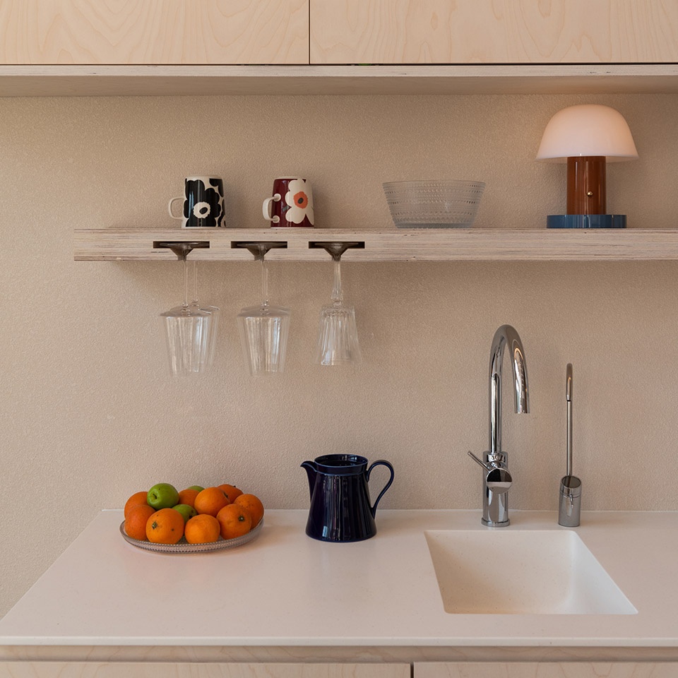 Old House Materials: Seves Czech Textured Glass Blocks, Grabo Three-Layer Engineered Wood Flooring, Nine Degree Ceramic Tiles, Teknos Timantti Waterproof Paint, Formica Surell, Häfele Hardware