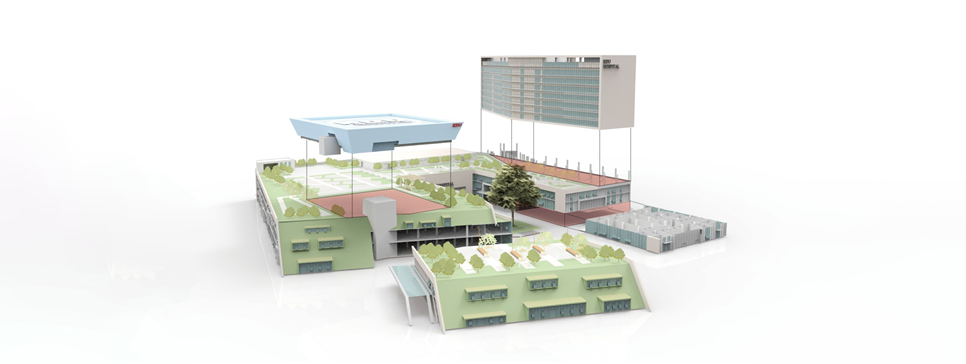 裙房是连接病房楼和会议中心的纽带,整体性、标准化和与功能的协调一致,是我们重点思考的内容。