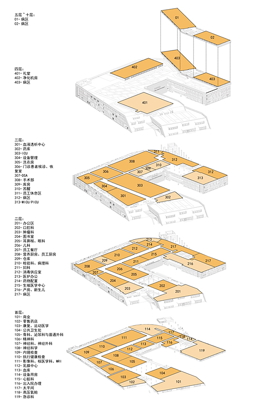Dividing departments based on body parts and disease orientation to provide precise services is different from the traditional division of internal and surgical departments in China. The Western medical system determines that they divide departments based on body parts and disease orientation, and provide precise medical services centered on patients. According to this model, we divide clinical departments into cardiovascular disease center, neurological disease center, renal, urinary and reproductive disease center, tumor center, endocrine and metabolic disease center, obstetrics and gynecology breast disease center, children's disease center, oral disease center, ophthalmology ear, nose and throat disease center, etc. Then allocate the area of these centers according to the size of their business volume, divide them into zones, and separate them on both sides of the main medical street; Each center is independently equipped with various small-scale examination equipment and facilities related to diseases, forming an integrated diagnosis, treatment, and examination system.